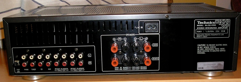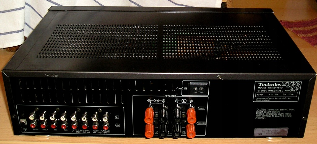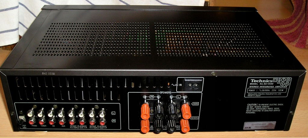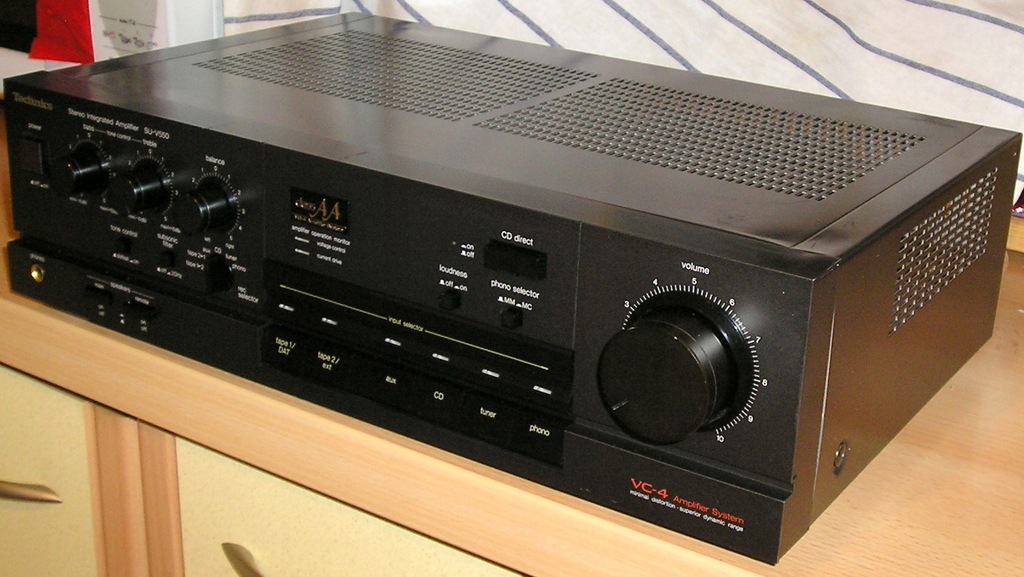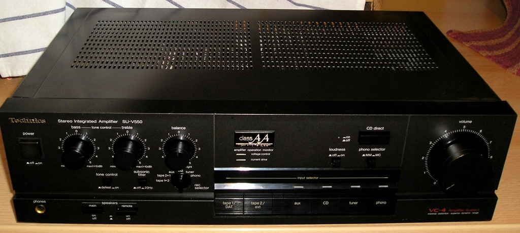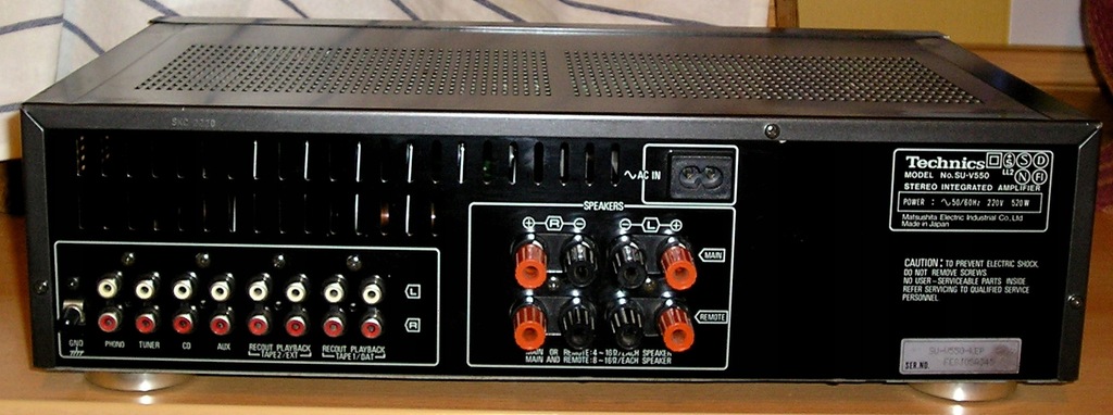 Sprzedam Czarny wzmacniacz Technics SU V 550 Made in Japan kupiony jeszcze za czasów Pewexu w dobrym stanie wizualnym i technicznym -polecam moze przyda się do jakiegoś ogródka piwnego pod 4 kolumny czy baru restauracji klubu młodziezowego czy seniora itd - duża moc wyjściowa przy 8 ohm po 60 W kanał i sprawność gwarantowana za rozsadne pieniądze .dane techniczne: VC4 -Ampifier System 4 oddzielne końcówki mocy dla każdego kanału ---Wzmocnienie 95 W na kanał przy 4 ohm --4 kanały stereo.---Możliwosć podłączenia 2 par kolumn.---Impedancja 4~16 ohm ---- Kondensatory- Klass AA -HighSpeed EX .---Regulacje- Bass, Sopran, Balance - Tone Control , Loudness, select MM i MC ,CD,Tuner,Phono--- CD-Direct doskonały czysty dźwięk bezpośrednio na końcówkę mocy omijając zbędną elektronikę.---Voltage Control -mikroprocesor sprawdza czy na kolumnach lub w samym wzmacniaczu nie ma jakiegoś zwarcia zabezpieczając tym samym nieumyślne spalenie końcówek mocy ---Curent Drive -Jeśli wszystko jest w porządku to czerwona dioda sygnalizuje gotowość wzmacniacza do pracy. ///////