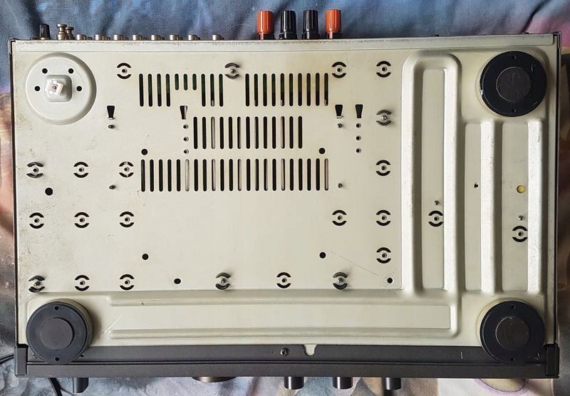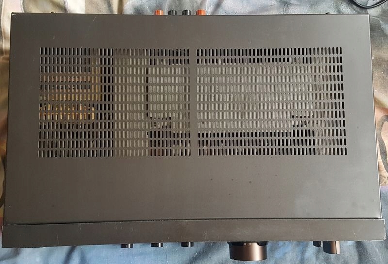 Wzmacniacz otrzymałem w rozliczaniu nie jest mi znana jego przeszłość. Stan wzmacniacza oceniam na dobry. Z takich pobieżnych oględzin: po włączaniu czasem przerywa jeden kanał trzeba poruszać potencjometrem od balansu lub przełącznikiem POWER AMP DIRECT później gra normalnie. Nie posiada jednej tylnej nóżki (zamontowany plastik aby wzmacniacz stał stabilnie). Środek wygląda na kompletny. Końcówka mocy oryginalna.