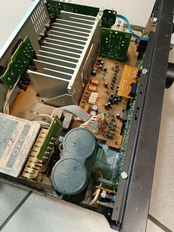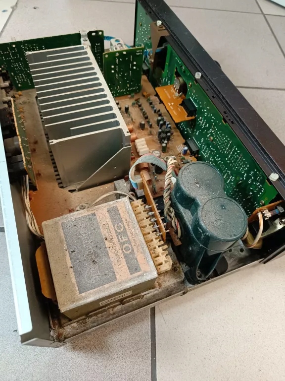 Stan - możliwe że uszkodzony. Jak widać ślady korozji/plam na obudowie od spodu. Sprzęt się uruchamia, dwie diody się święcą ale niestety nie mamy jak sprawdzić aktualnie czy sprzęt gra. Sprzęt nie wygląda na naprawiany. Wizualnie sprzęt ma sporo rys na obudowie.