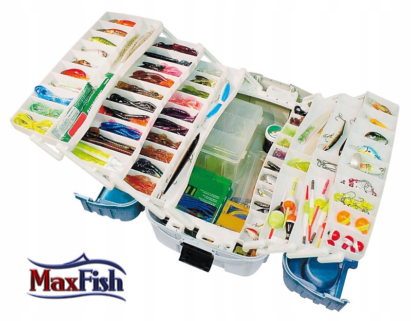 Nowoczesne, wielozadaniowe skrzynki wędkarskie z wysuwanymi szufladami.
