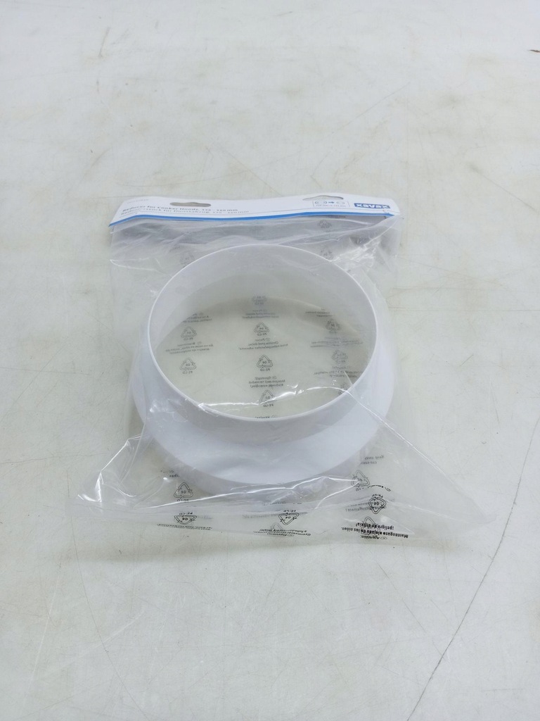Montaż: Nałożyć adapter na rurę (średnica zewnętrzna 150 mm) okapu, nałożyć rurę powietrzną (średnica wewnętrzna 125 mm) na łącznik