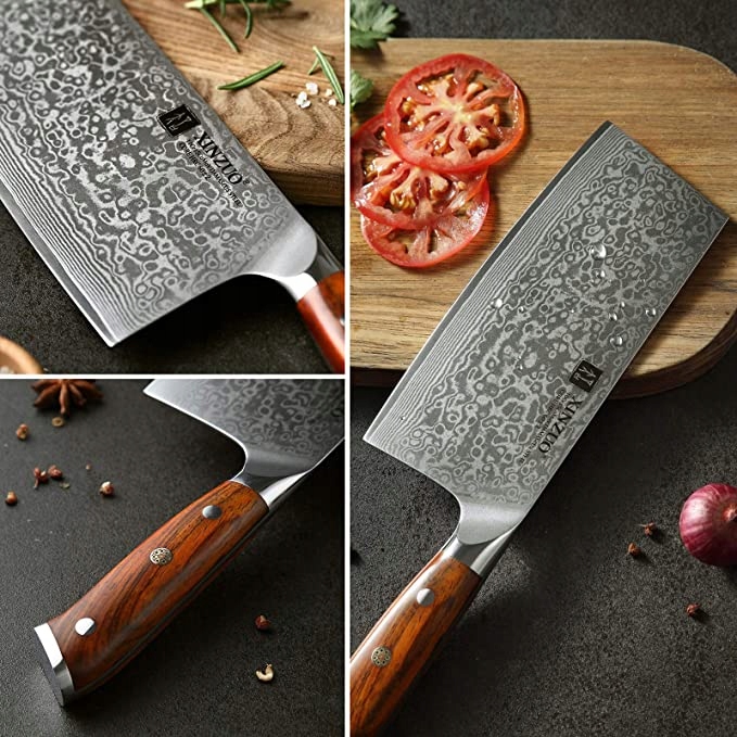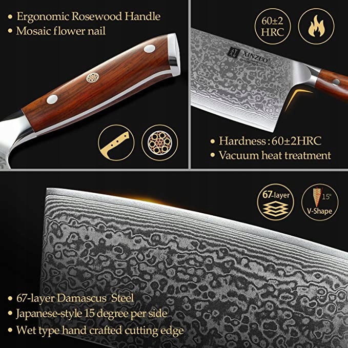67 warstw stali damasceńskiej, rdzeń ze stali 10Cr zapewnia twardość i stabilność, twardość ostrza może osiągnąć 62 HRC. Dzięki kątowi ostrza w kształcie litery V 12-15 stopni ostrze to ma ostrą krawędź tnącą.