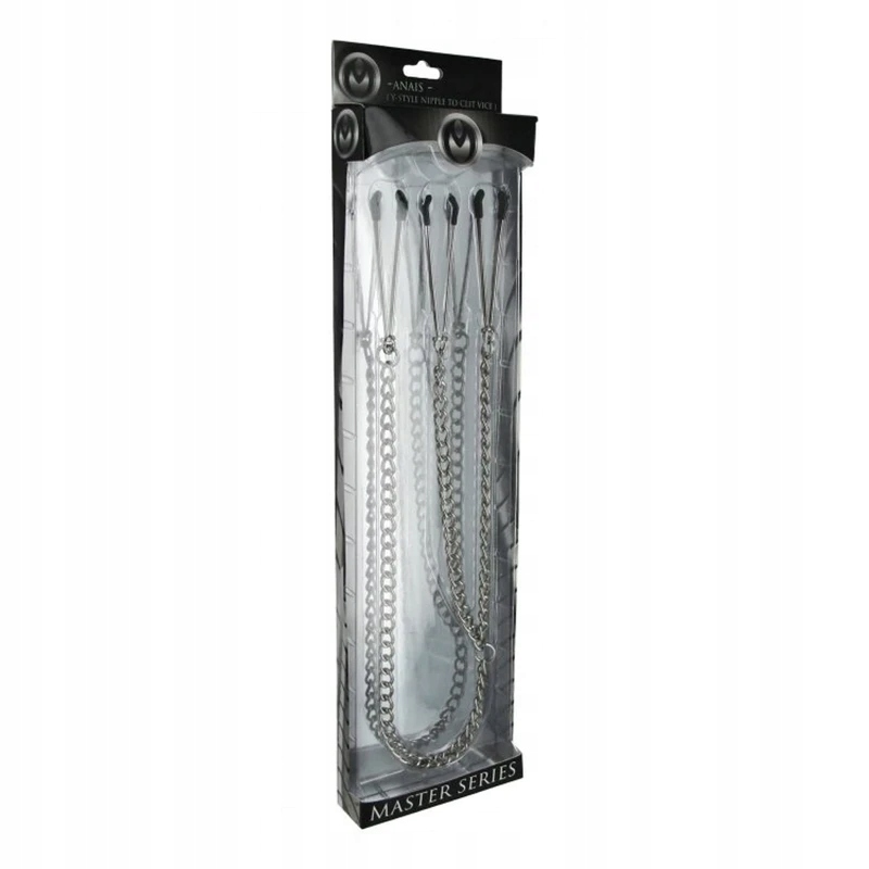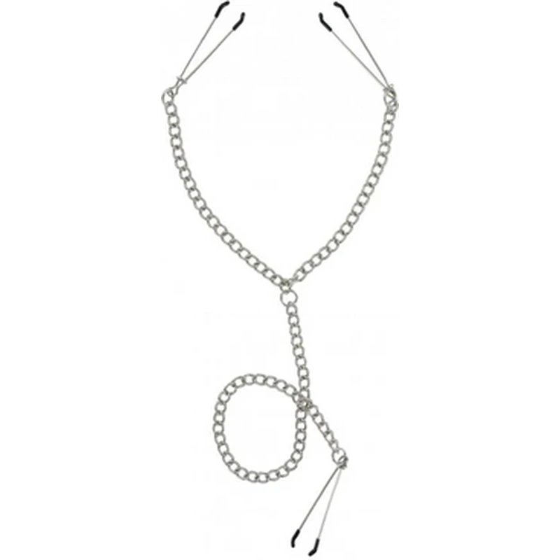 Te zaciski mają końce pokryte winylem, łańcuch z ogniwami i przesuwany pierścień, aby dostosować napięcie od wystarczającego, aby je utrzymać, aż do naprawdę poważnego, torturującego cycki szczypania.