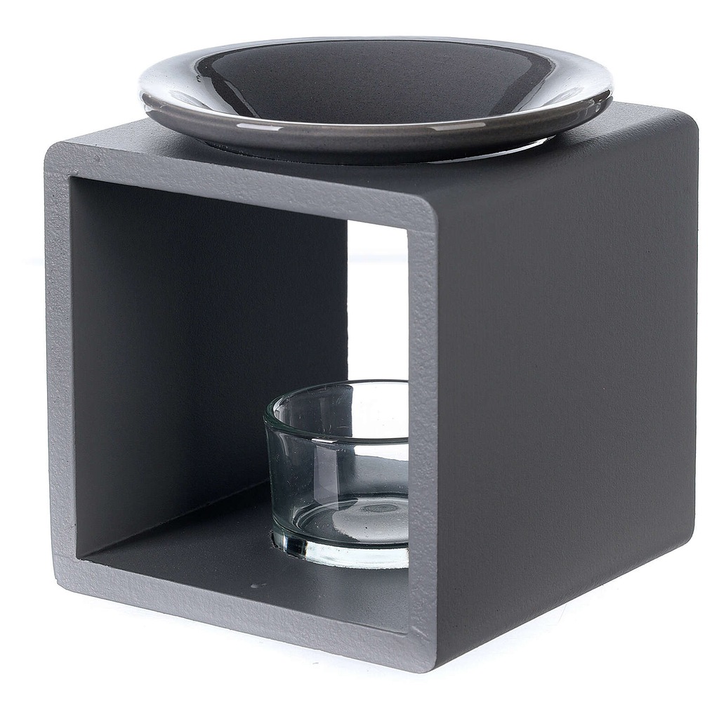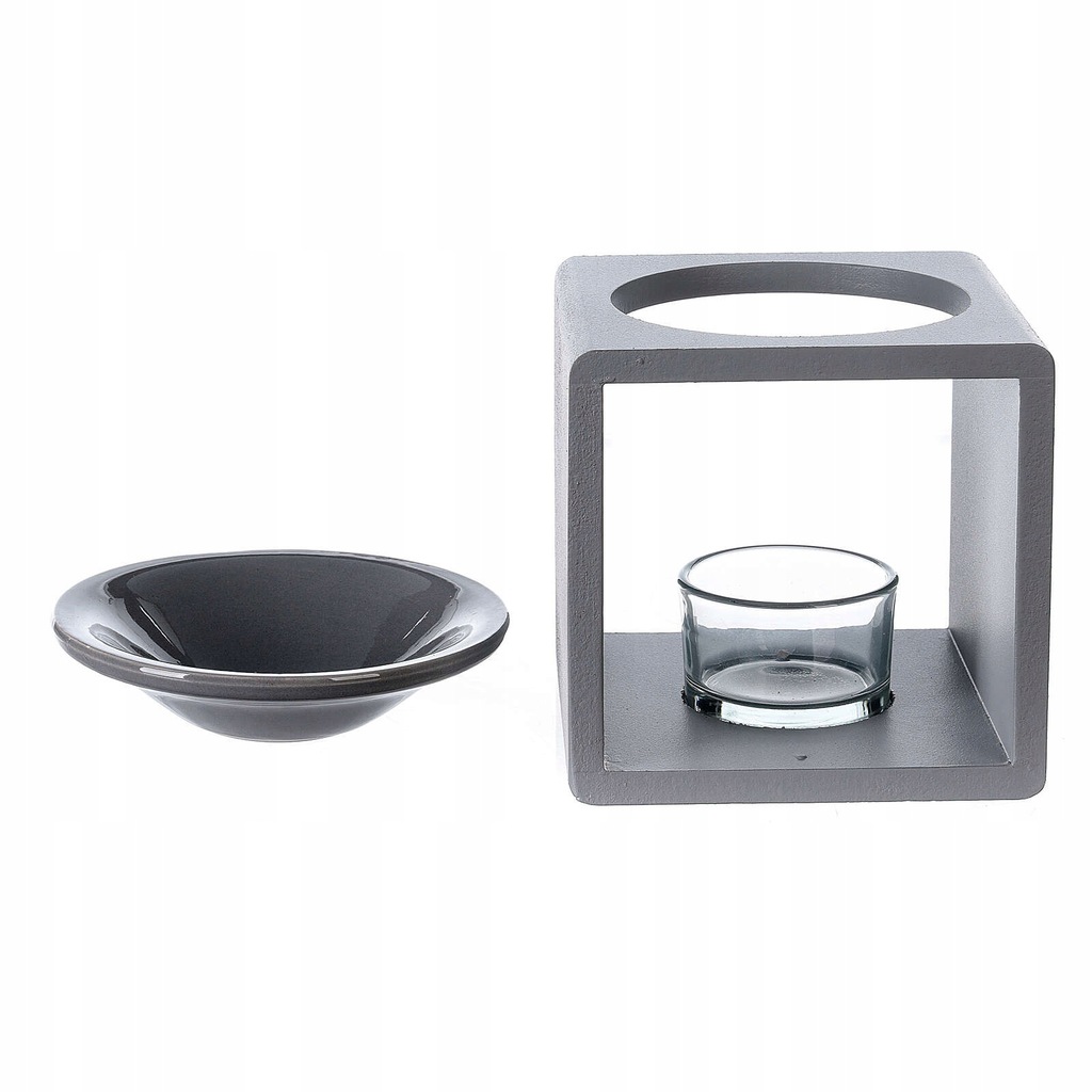 Ma formę otwartej kwadratowej kostki z talerzykiem na górze do olejków eterycznych.