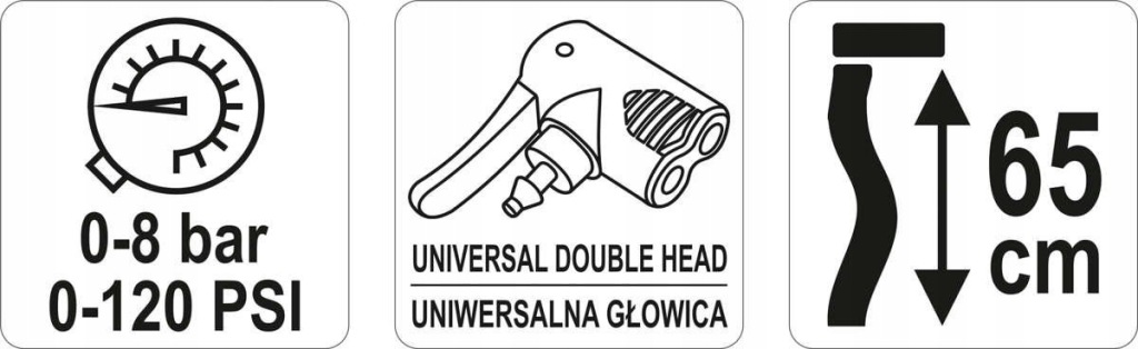 Posiada uniwersalną głowicę do pompowania wentyli samochodowych i rowerowych.