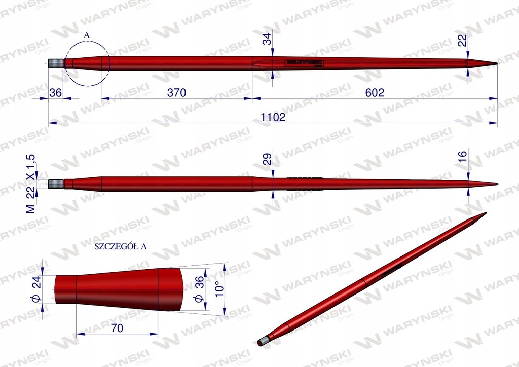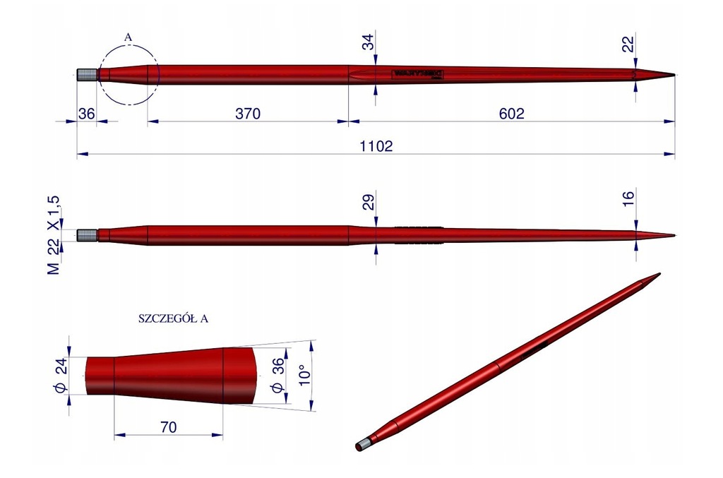 Ząb ładowacza czerwony prosty L- 1100 mm do 5193-RT1 Tur WARYŃSKI W9132-1000P W3132-1000P