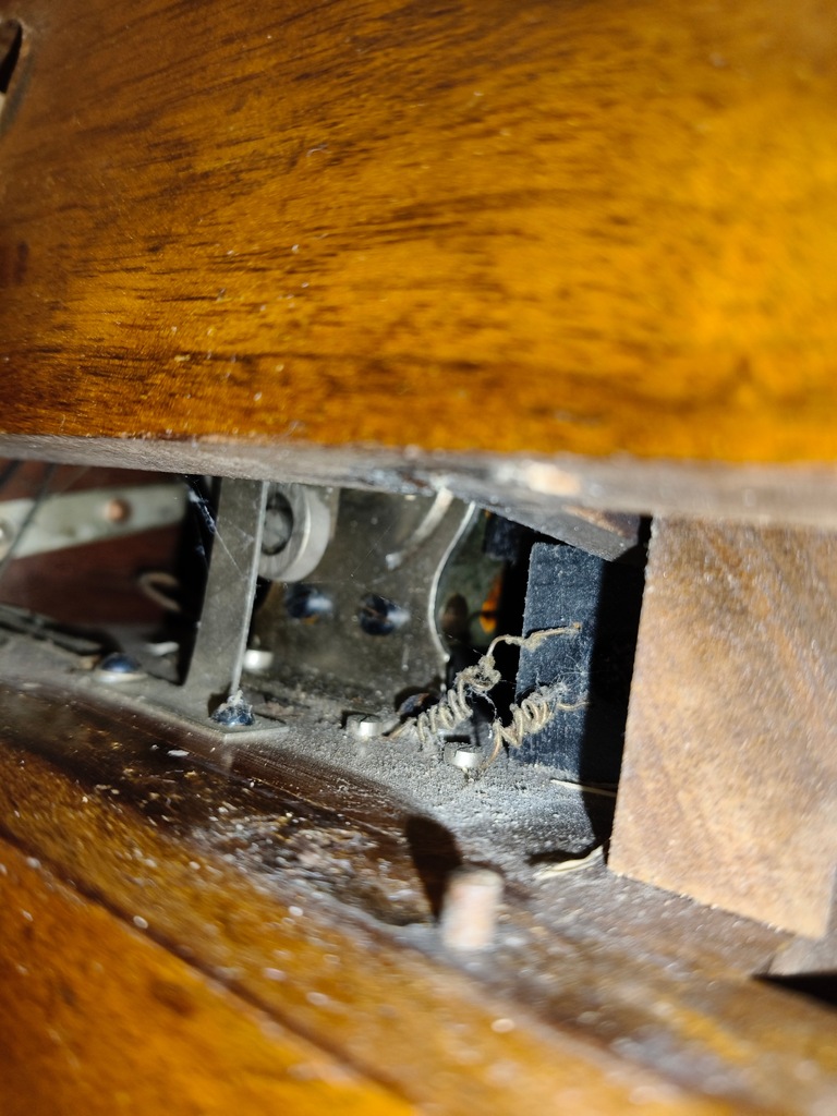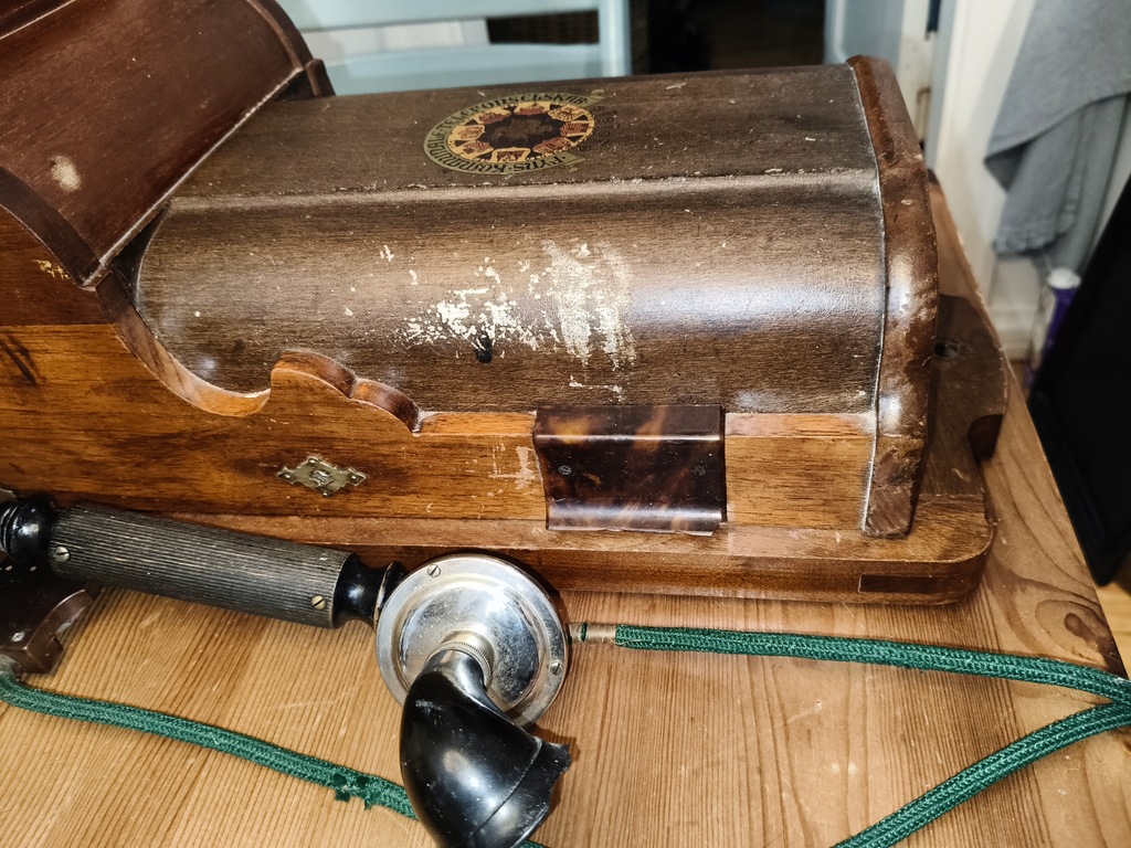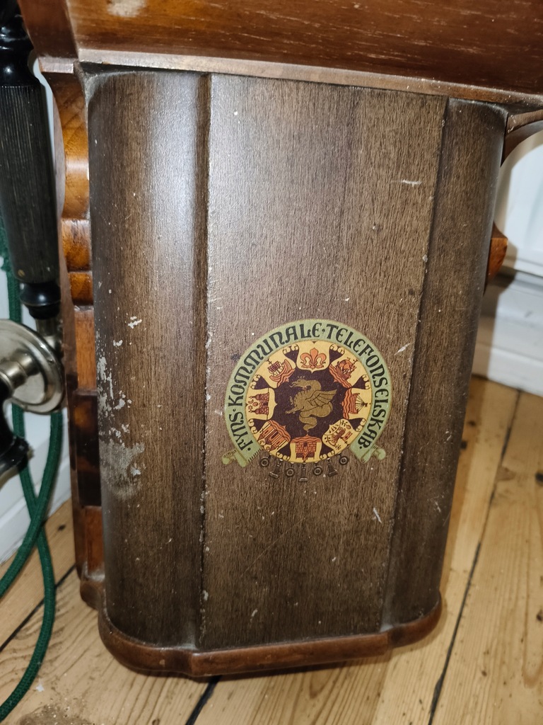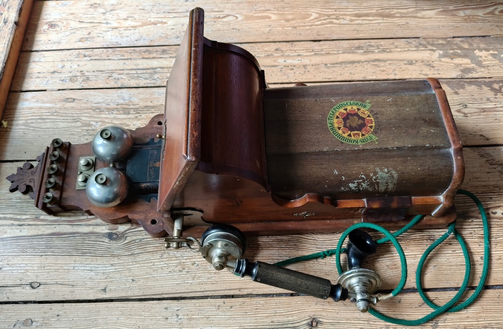 Telefon wykonany z litego drewna (prawdopodobnie dąb), z zachowanymi metalowymi elementami – dzwonki, korbka i słuchawka. Na przednim panelu widoczny oryginalny herb producenta. Urządzenie było używane w czasach telefonii ręcznej – do nawiązywania połączeń służyła korbka, która uruchamiała sygnał centrali.