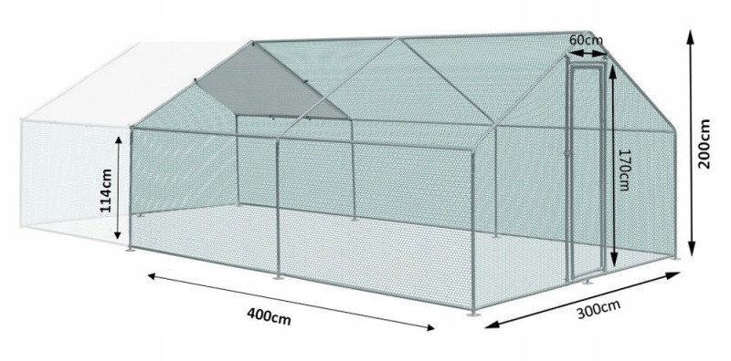 - Wymiary ogrodzenia: 3 m x 4 m x 2 m