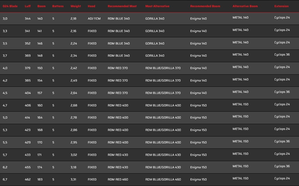 W żaglach 024 Blade zastosowano GRADIENT PANEL TECHNOLOGY, a także wysokiej klasy materiały takie jak VX2 i EM4.