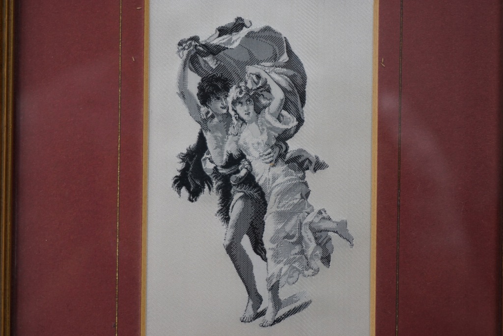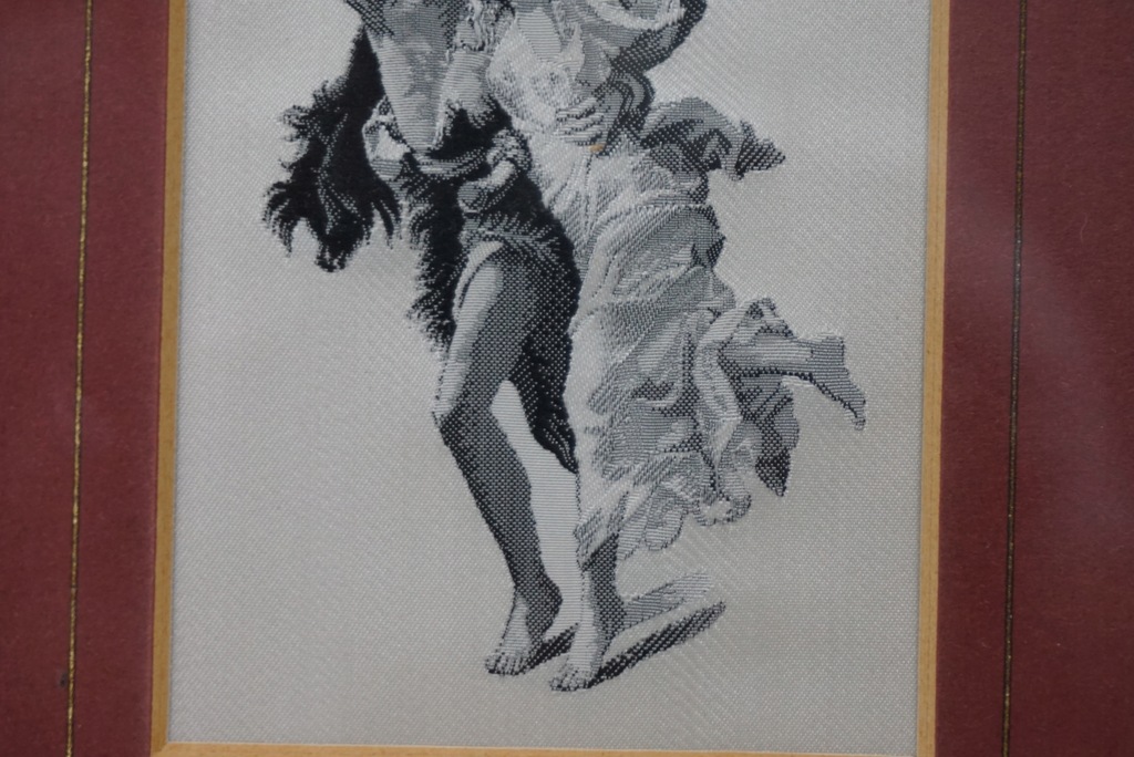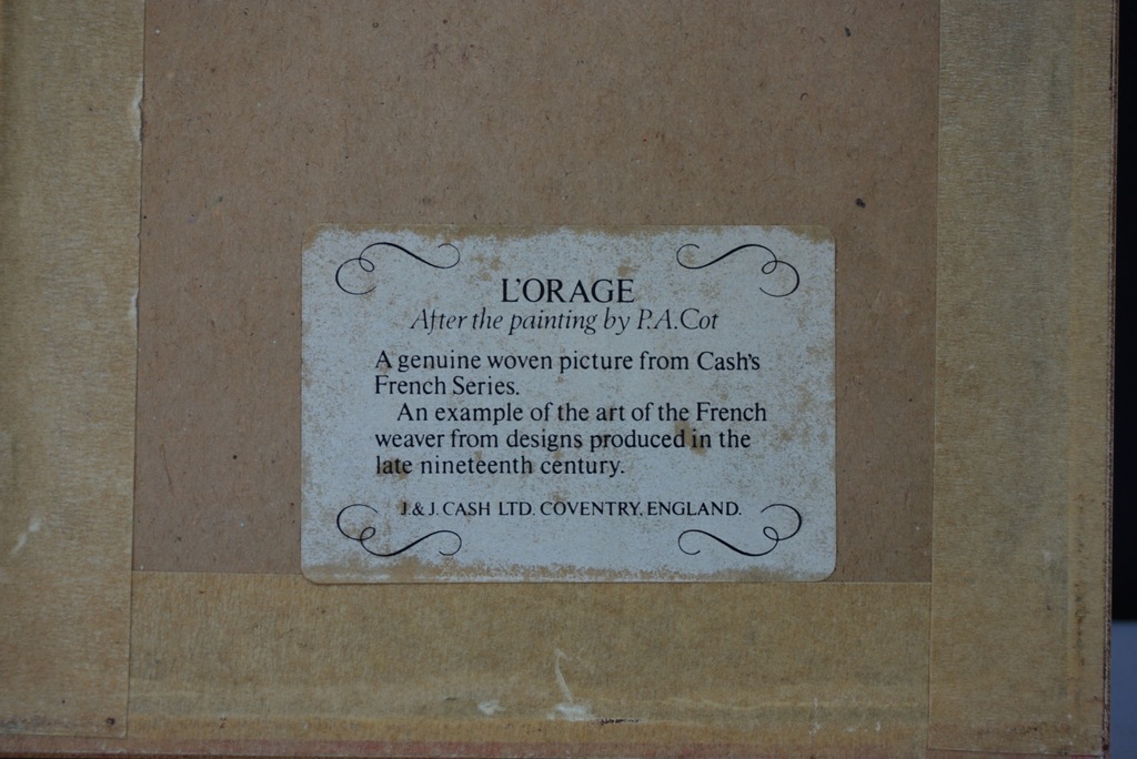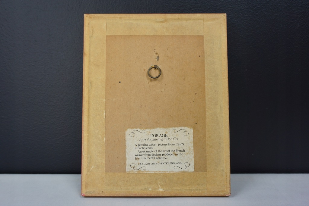 Francuski żakard z końca XIX wieku. Wykonany na podstawie obrazu "Burza" Pierre Auguste Cota. Stan ukazany na foto. Rama 16.5cm x 21cm. Żakard 6.5cm x 10.5cm.