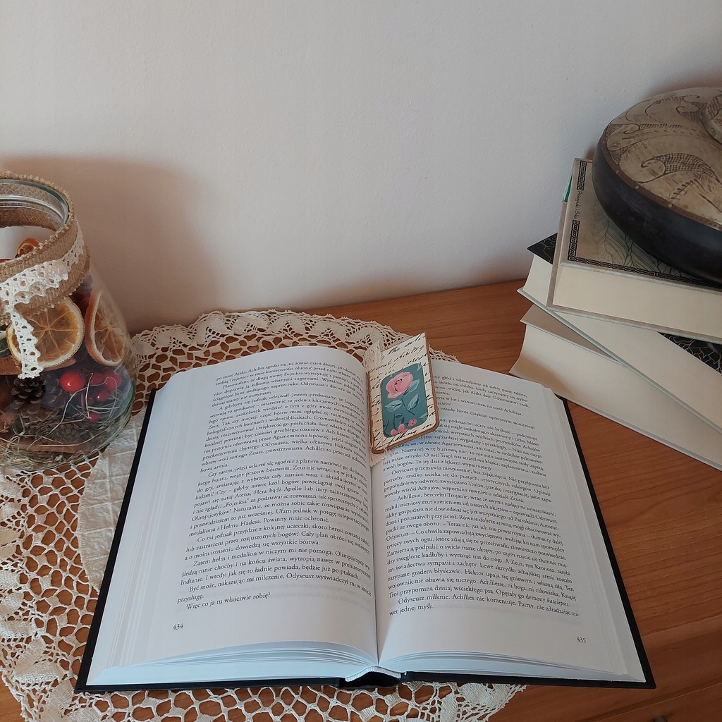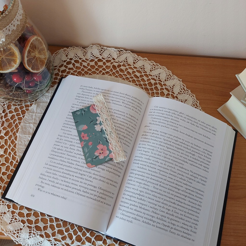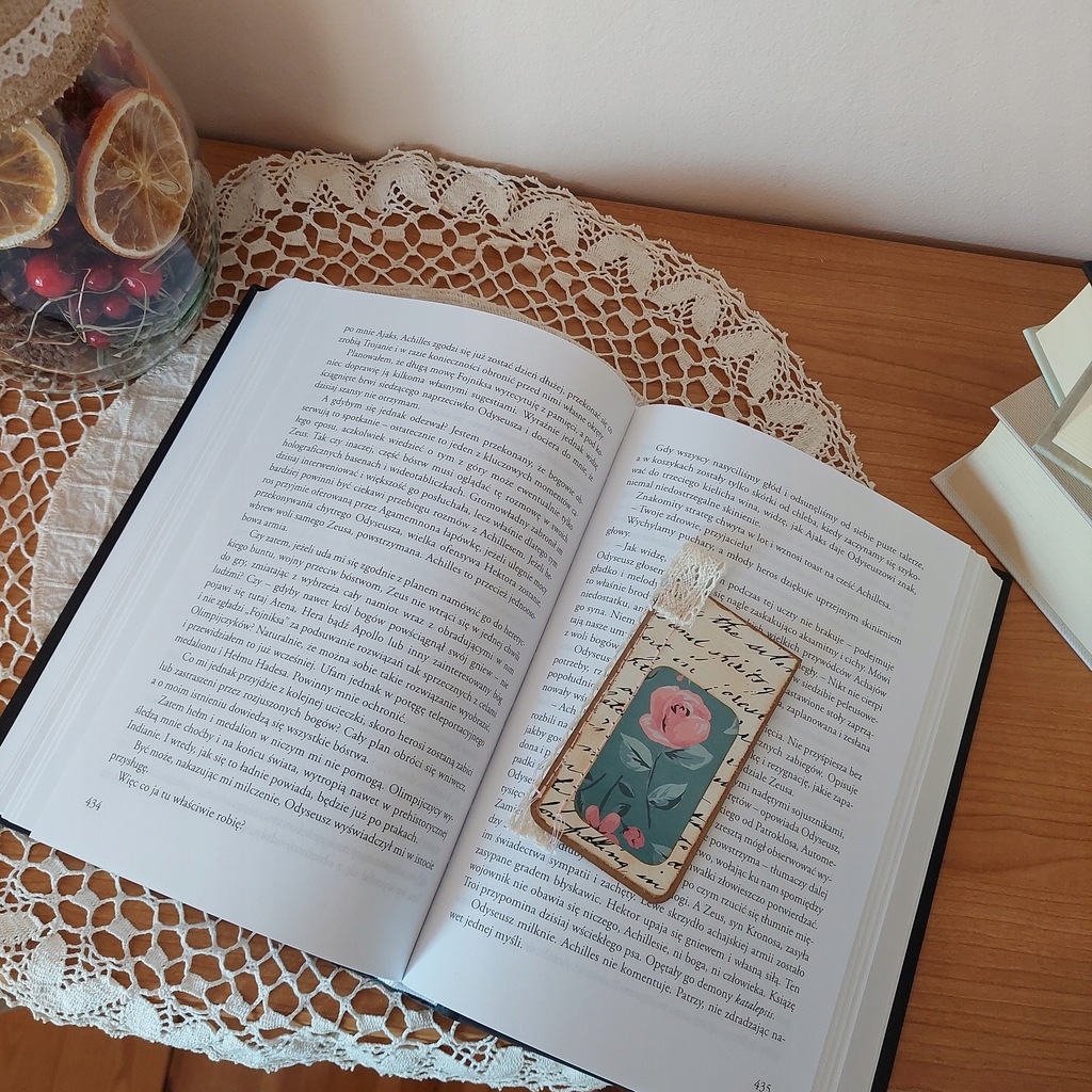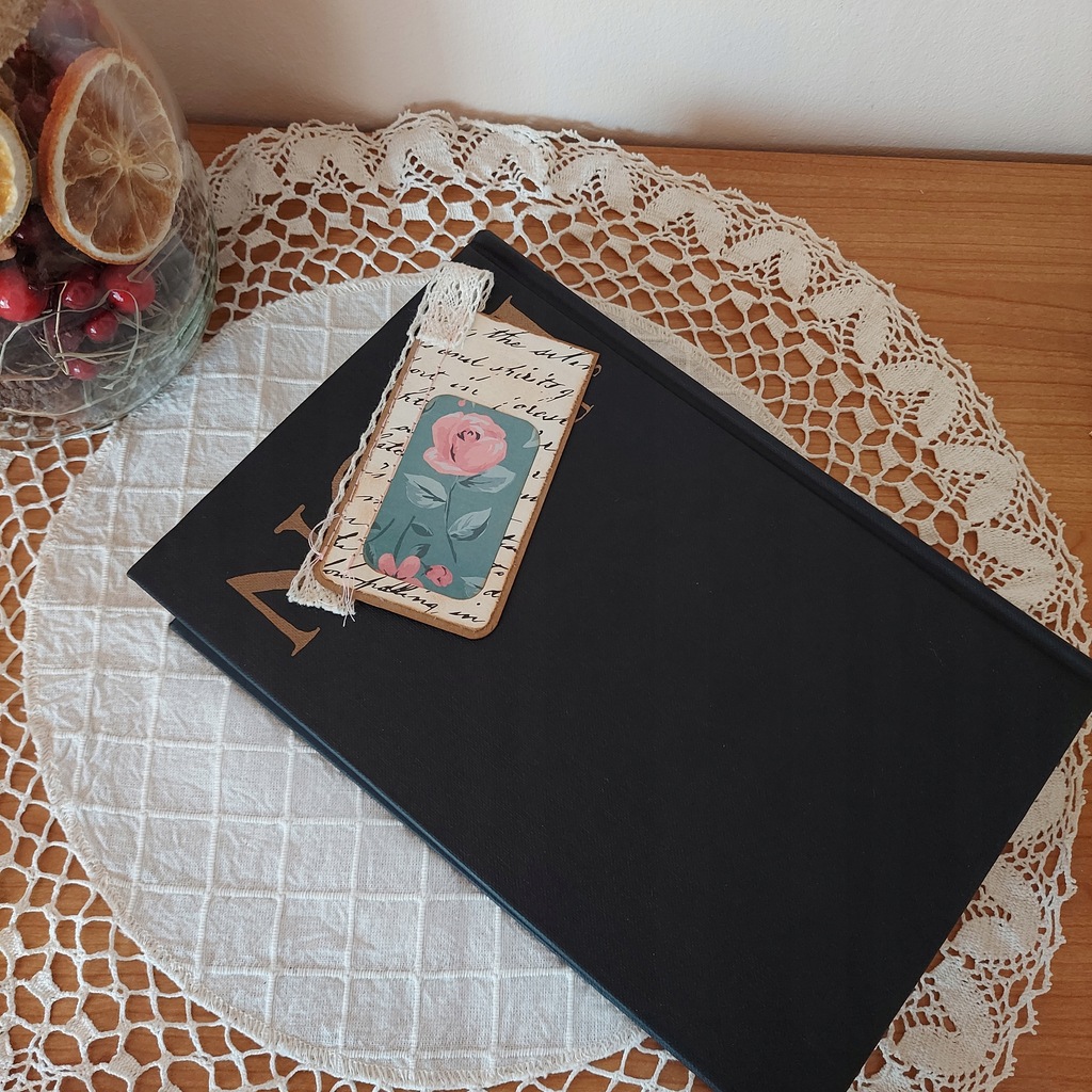 Wykonana ręcznie, techniką scrapbookingu. W odcieniach różu, zieleni i brązu. Ręcznie przeszyta z ozdobną koronką.