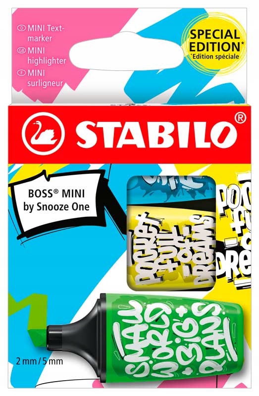 STABILO BOSS MINI by Snooze One to nowa, limitowana edycja popularnego zakreślacza mini w neonowych kolorach. Tym razem jednak do radosnych barw: żółtej, zielonej, pomarańczowej, różowej i niebieskiej dołączył czarny marker w mini formacie, który umożliwia rysowanie wyraźnego konturu oraz tworzenie efektu trójwymiarowego. Tworzenie kolorowych napisów będzie teraz prawdziwą radością! Kartonowe etui zawierające 3 szt. zakreślaczy w kolorach: żółty, niebieski, zielony.