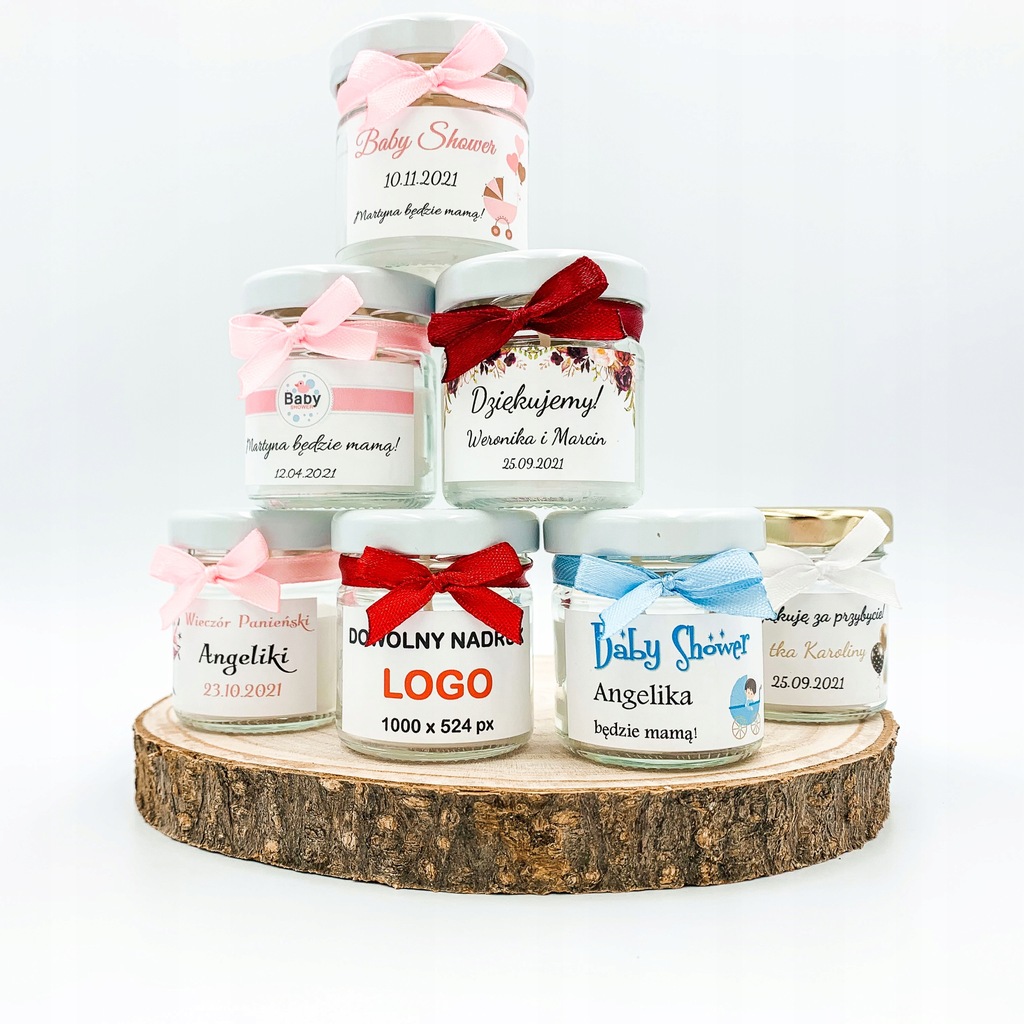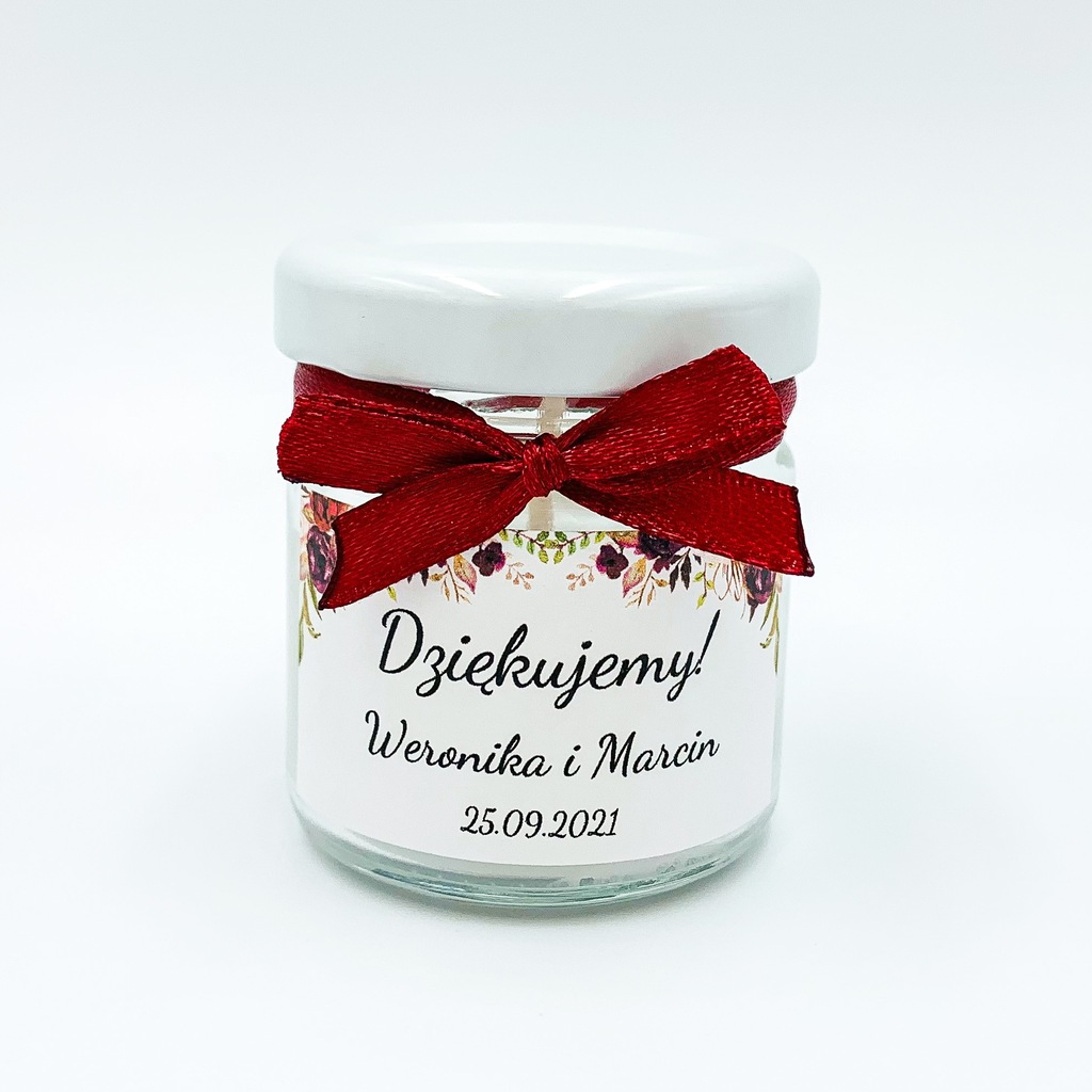 Na słoiczku naklejona jest etykieta z napisem "Dziękujemy!" wraz z imionami i datą ślubu. Na etykiecie znajduje się ozdobna grafika.