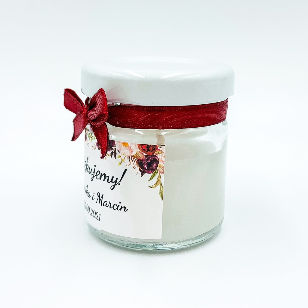 Podziękowanie dla gości za obecność na weselu w formie zapachowej świeczki w słoiczku.
