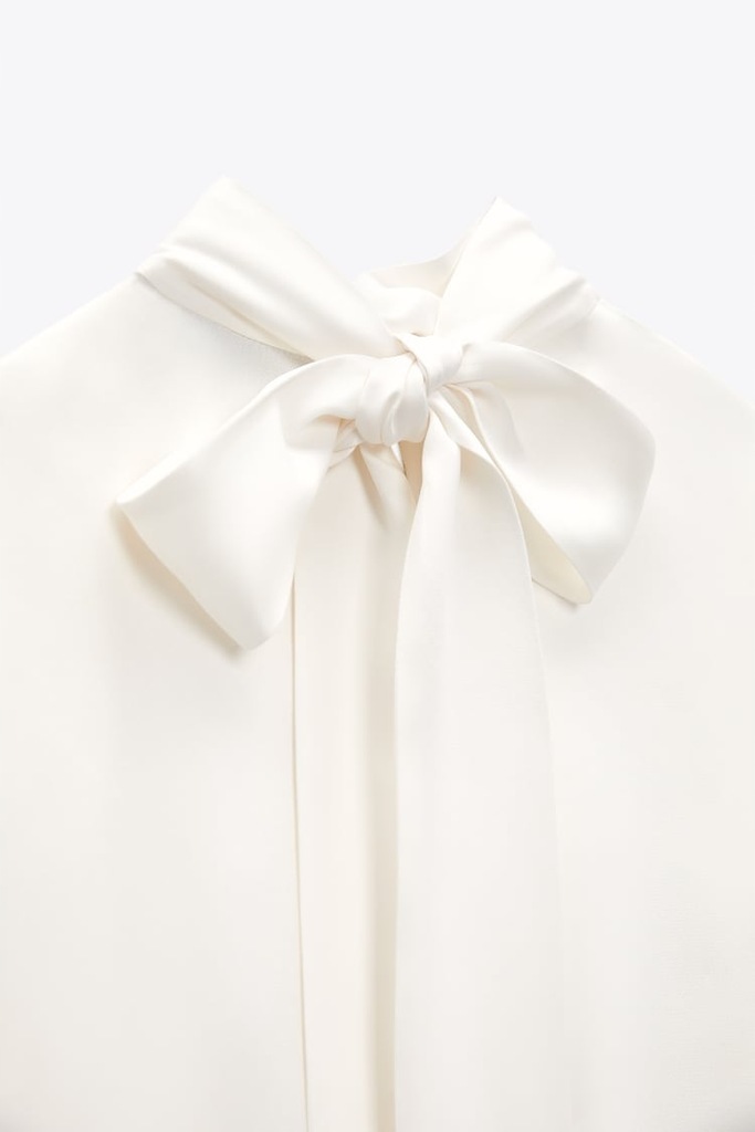 Satynowana bluzka z tkaniny wiskozowej. Okrągły dekolt. Rozcięcie z wiązaniem przy szyi. Troczki z tej samej tkaniny. Długi rękaw. Odpinane pióra przy mankiecie. Rozcięcie z zapięciem na guzik z tyłu.