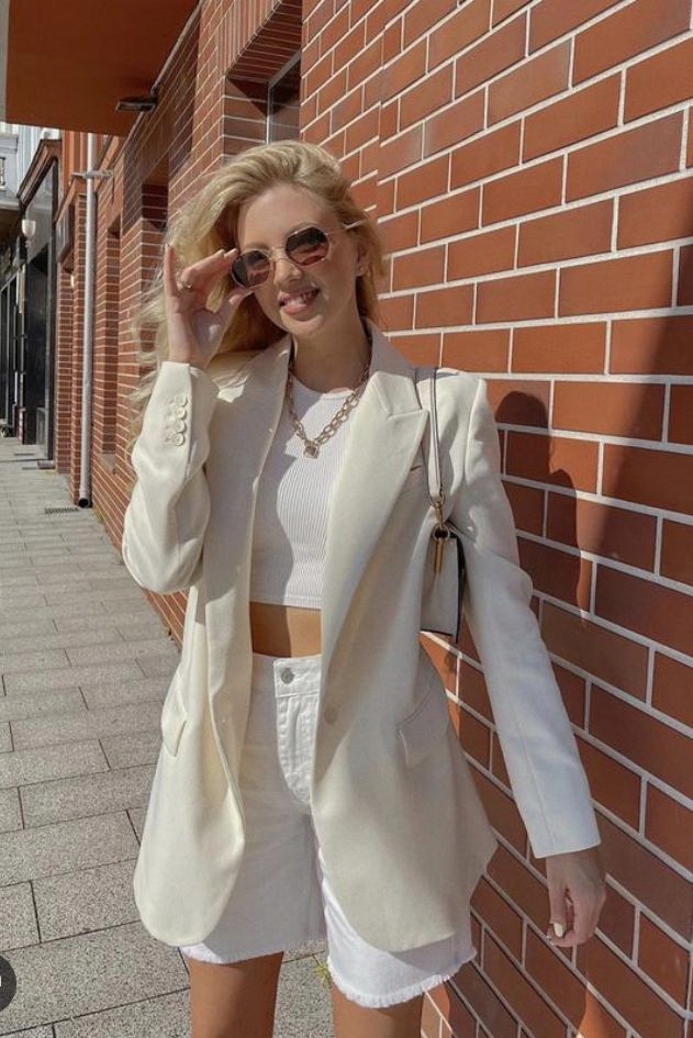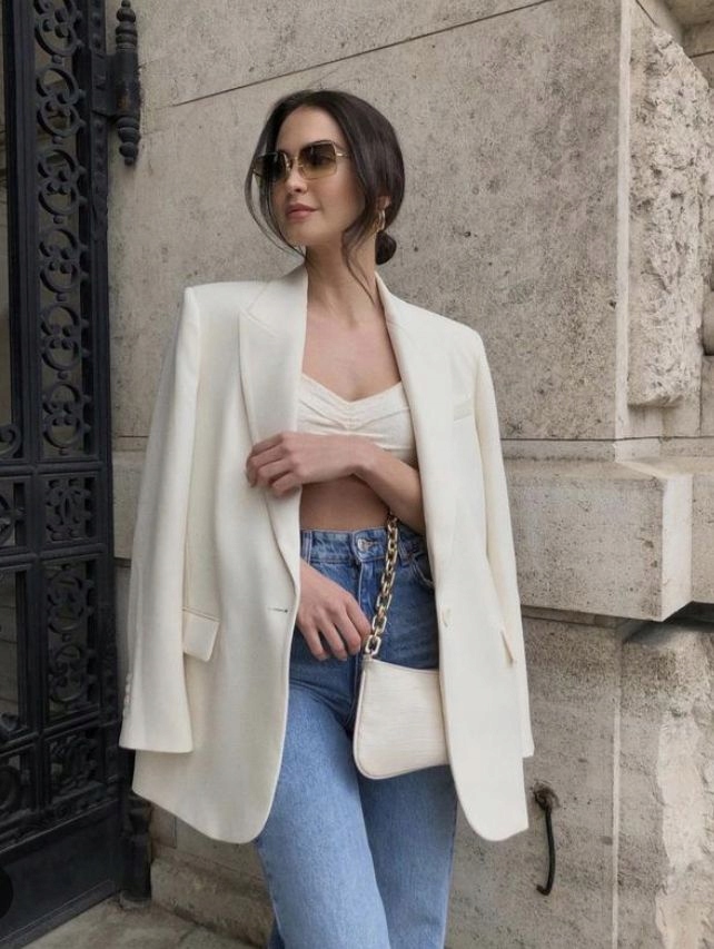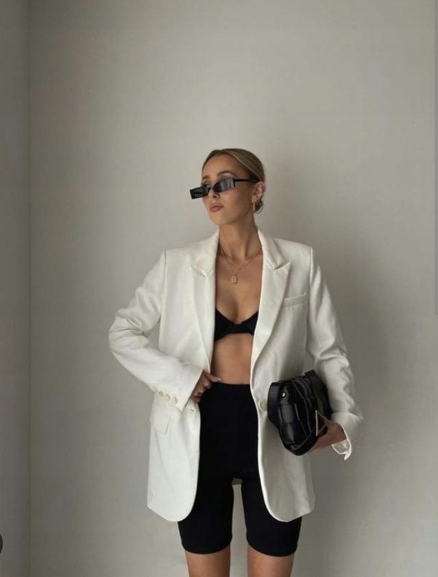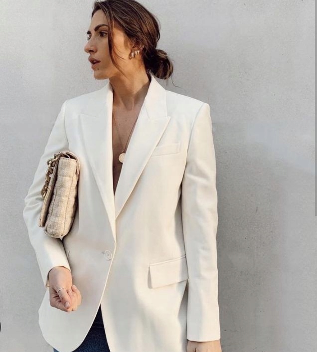 Marynarka z kołnierzem z klapami. Długi rękaw. Poduszki na ramionach. Kieszenie z przodu. Szlic. Zapięcie na guzik z przodu.