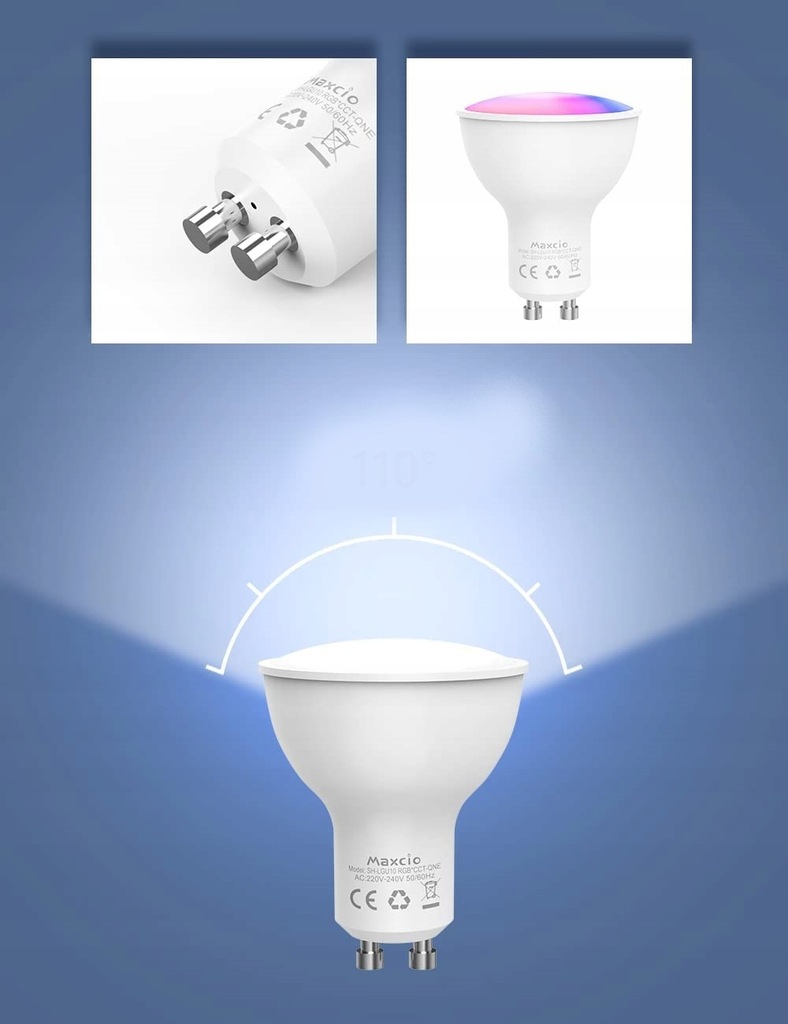 - Inteligentne żarówki Maxcio GU10 są kompatybilne z Amazon Alexa i asystentem Google, umożliwiają sterowanie światłami za pomocą prostych poleceń głosowych, uwalniają ręce, gdy jesteś zajęty. Możesz także sterować inteligentnymi żarówkami w dowolnym miejscu i czasie za pomocą aplikacji "Smart Life"/"Maxcio" na smartfonie lub tablecie (bez koncentratora, tylko Wi-Fi 2,4 GHz).