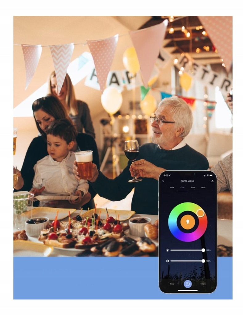 - Twórz ulubione efekty świetlne z 16 milionami różnych kolorów. Przełącz się na zimną biel, biel światła dziennego, biel ciepłą zgodnie z codziennymi potrzebami oświetleniowymi. Wszystkie biele i kolory są ściemniane od 1% do 100%.