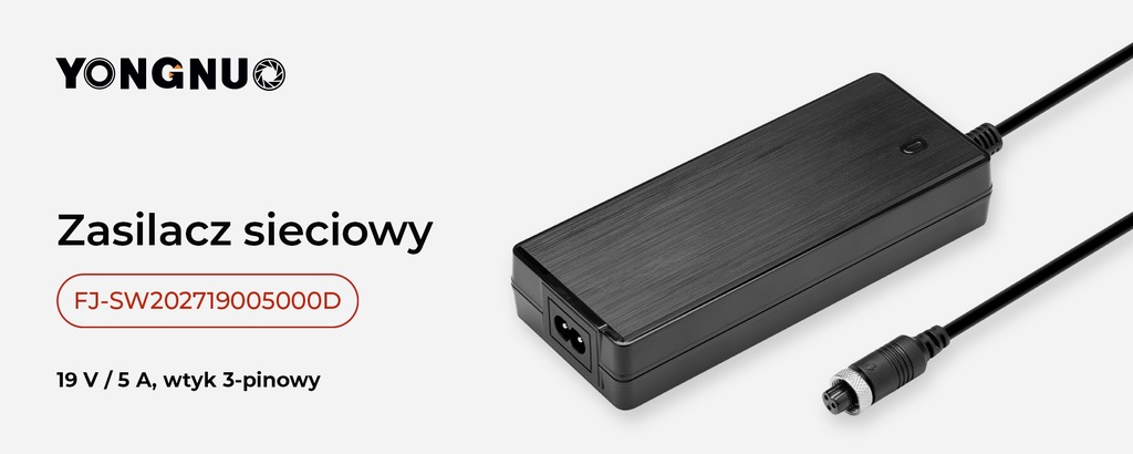 Yongnuo FJ-SW202719005000D to solidnie wykonany oraz wydajny zasilacz sieciowy. Został zaprojektowany z myślą o urządzeniach wymagających napięcia 19 V i natężenia 5 A. Zasilacz posiada 3-pinowy wtyk zasilania pasujący do lamp Yongnuo z serii YN760 oraz YN1200.