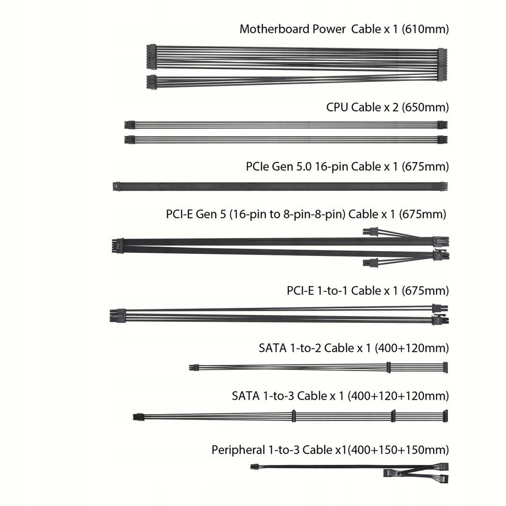 - Przewody: Prąd przemienny, Procesor, PCIe, Peripheral (Molex), SATA
