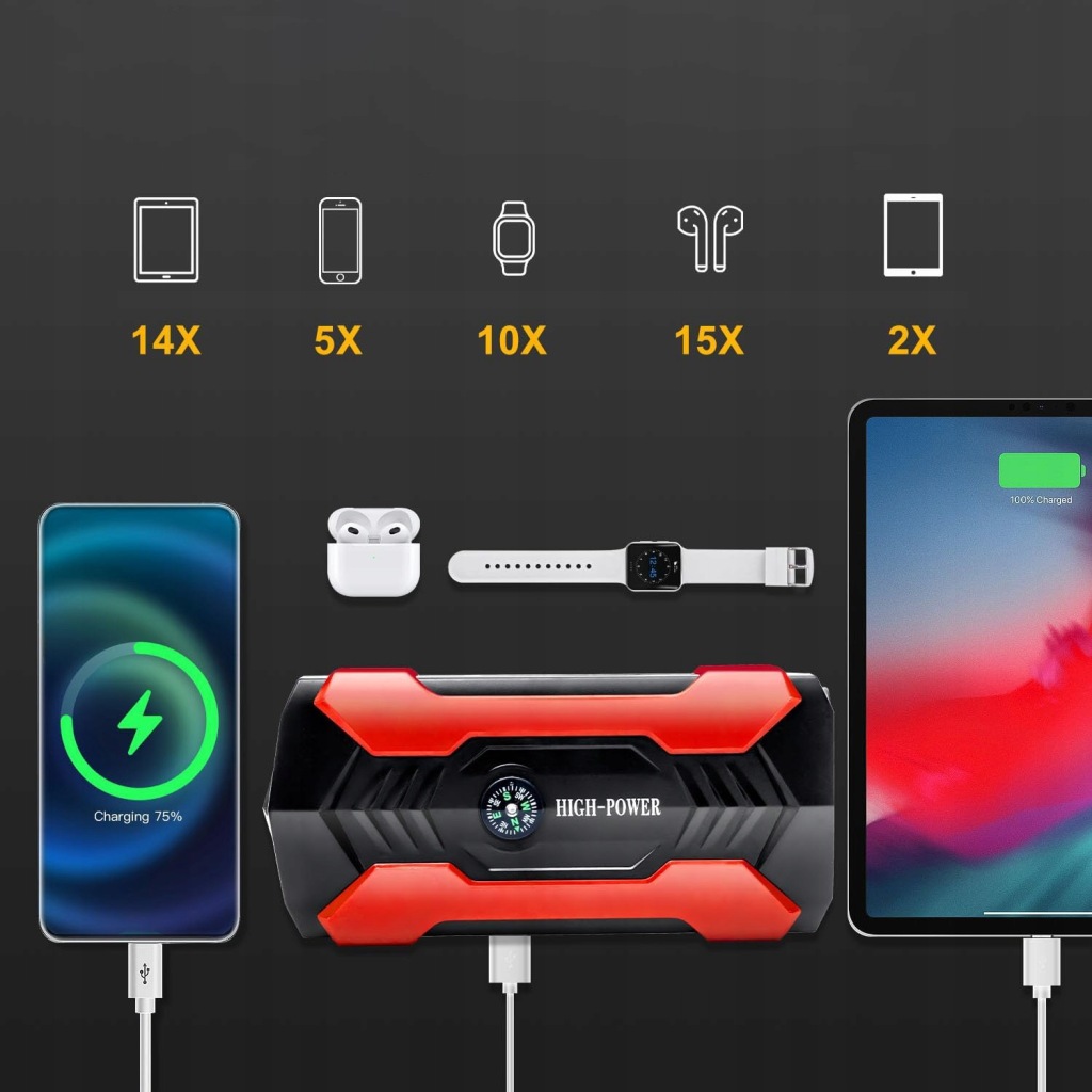 - ✔️ 800A bezpiecznie uruchamia silnik benzynowy o pojemności 6,0 l lub silnik wysokoprężny o pojemności 3,0 l w samochodzie, SUV, ciężarówce lub furgonetce w ciągu kilku sekund za pomocą naszego przenośnego rozrusznika samochodowego, co zapewnia około 30 uruchomień po pełnym naładowaniu.