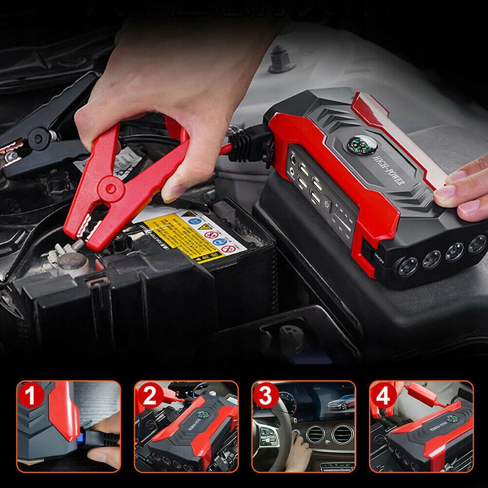 - ✔️ Podłącz czerwony i czarny zacisk do akumulatora samochodowego > podłącz oba końce przewodu do źródła zasilania rozruchowego > uruchom samochód.