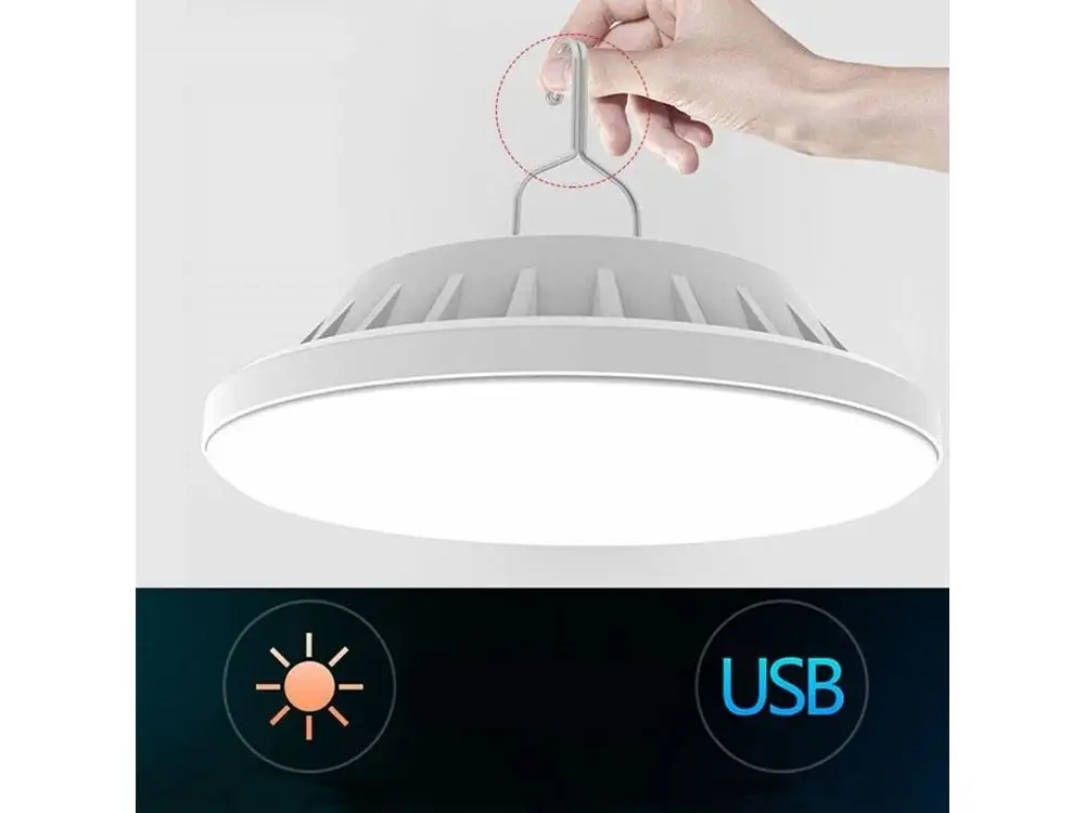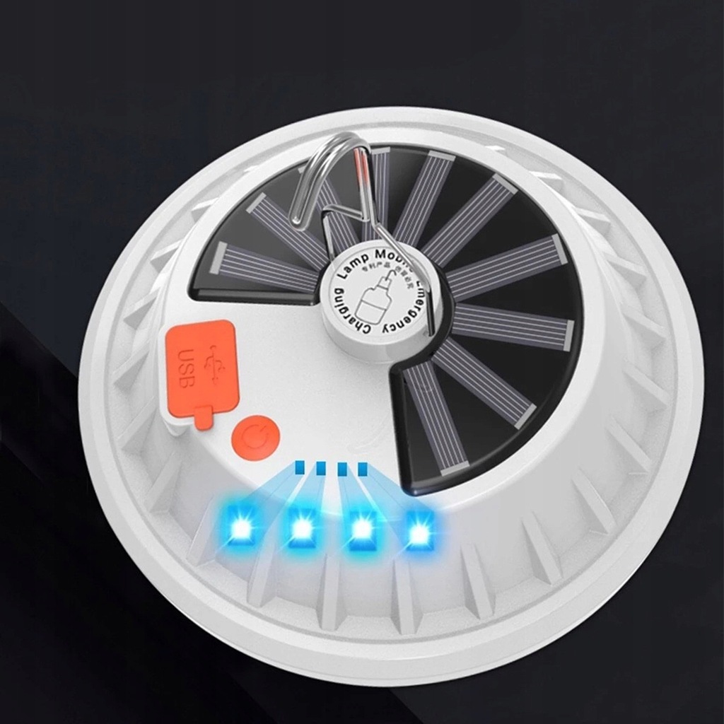 Funkcjonalna lampa campingowa zasilana z wbudowanego akumulatora i panelu solarnego. Możliwość zawieszenia w namiocie (wbudowany uchwyt). Stanowi mocne źródło światła dzięki zastosowaniu diod LED. Lampa jest odporna na kurz, wstrząsy i zachlapanie (IP65), z powodzeniem sprawdzi się w warunkach zewnętrznych. Posiada kilka trybów świecenia oraz regulację mocy świecenia. Wbudowany port USB umożliwia ładowanie dodatkowych urządzeń (np. telefonu).
