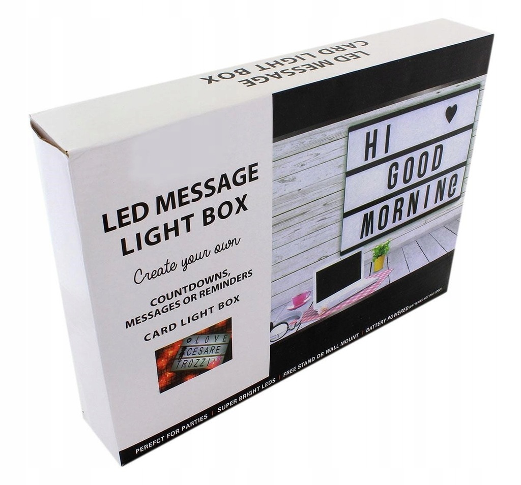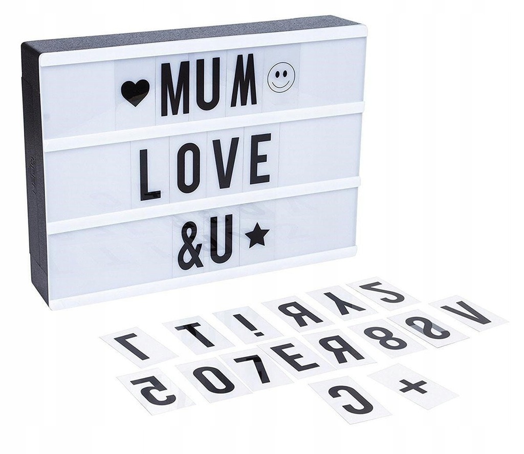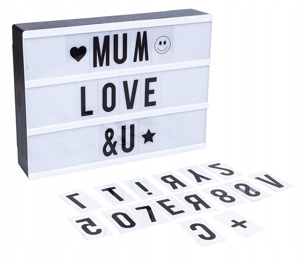 Podświetlana tablica informacyjna LED. Popularny Light-Box to doskonały sposób na stworzenie estetycznej witryny reklamowej. Możliwość zawieszenia na ścianie lub ustawienia na płaskiej powierzchni. W zestawie dołączone zostały aż 63 litery i znaki, które możesz dowolnie umieszczać na froncie witryny. Tablica wykorzystuje energooszczędne i jasne podświetlenie LED o białej barwie. Do jej zasilania wystarczy 6 baterii AA (nie musisz jej podłączać do sieci elektrycznej).