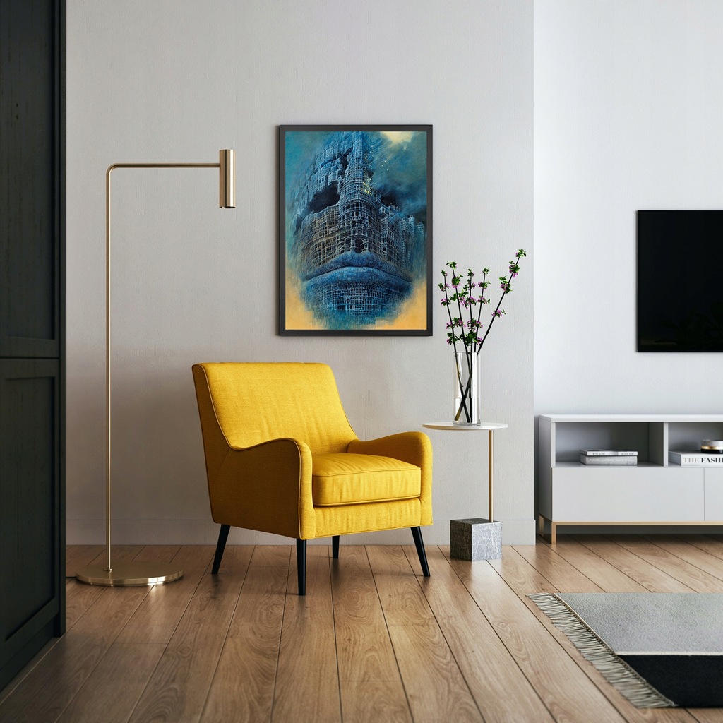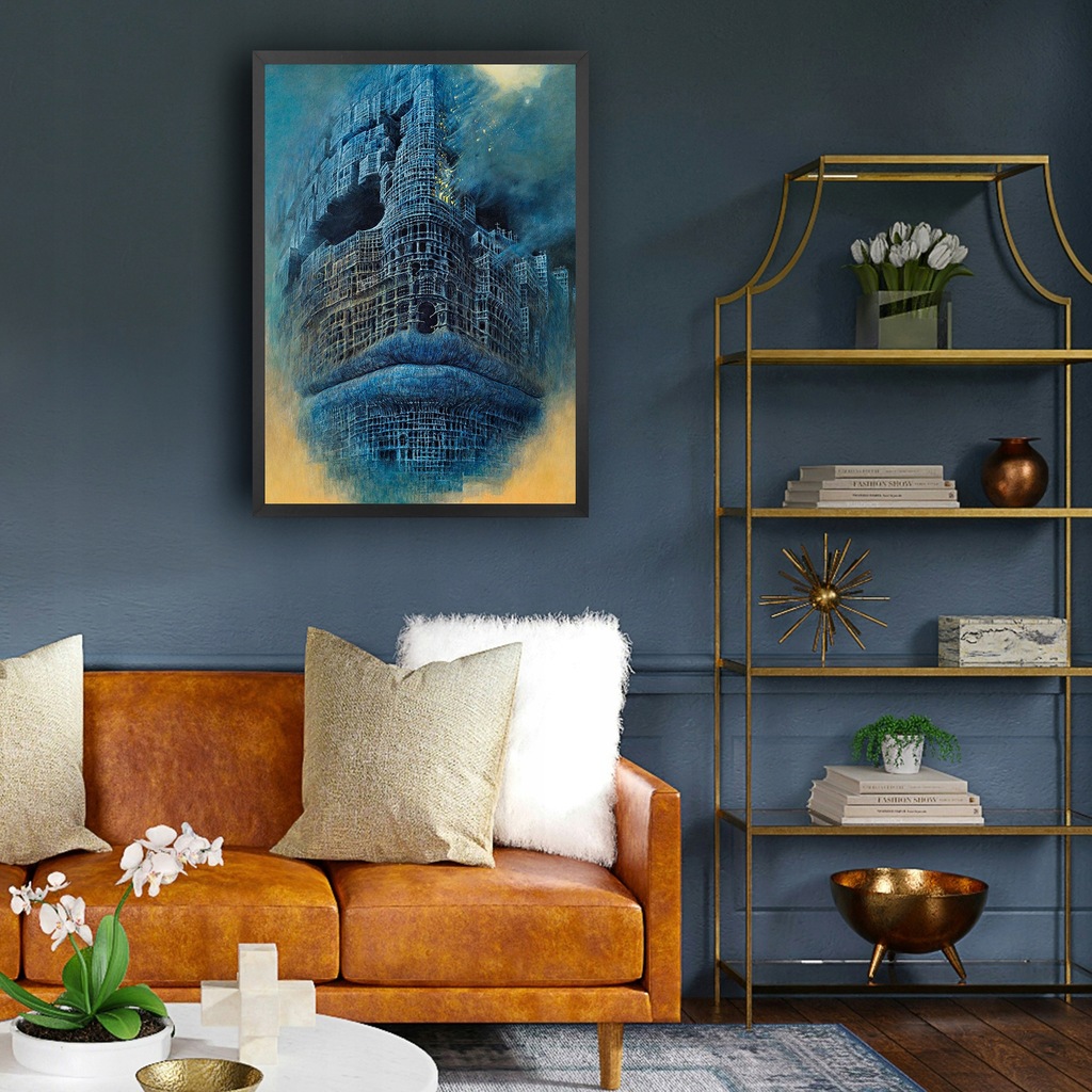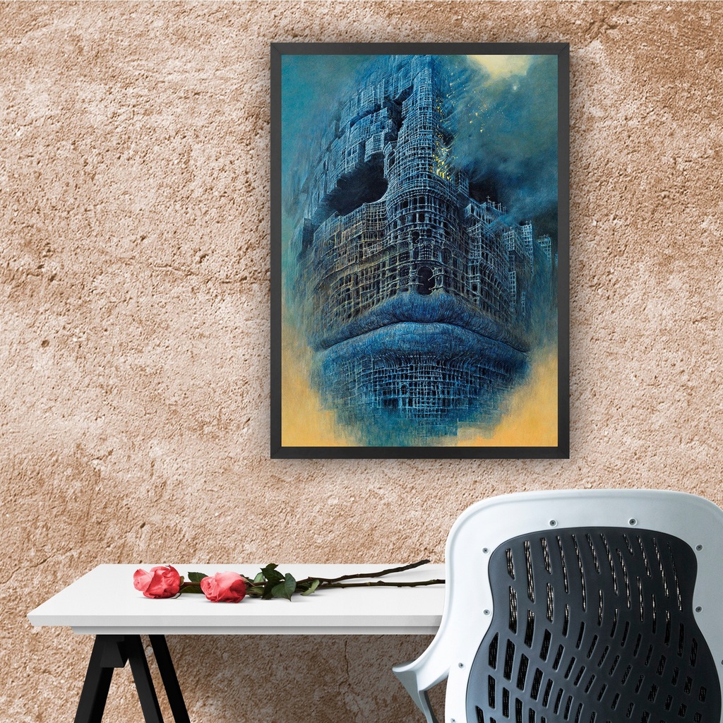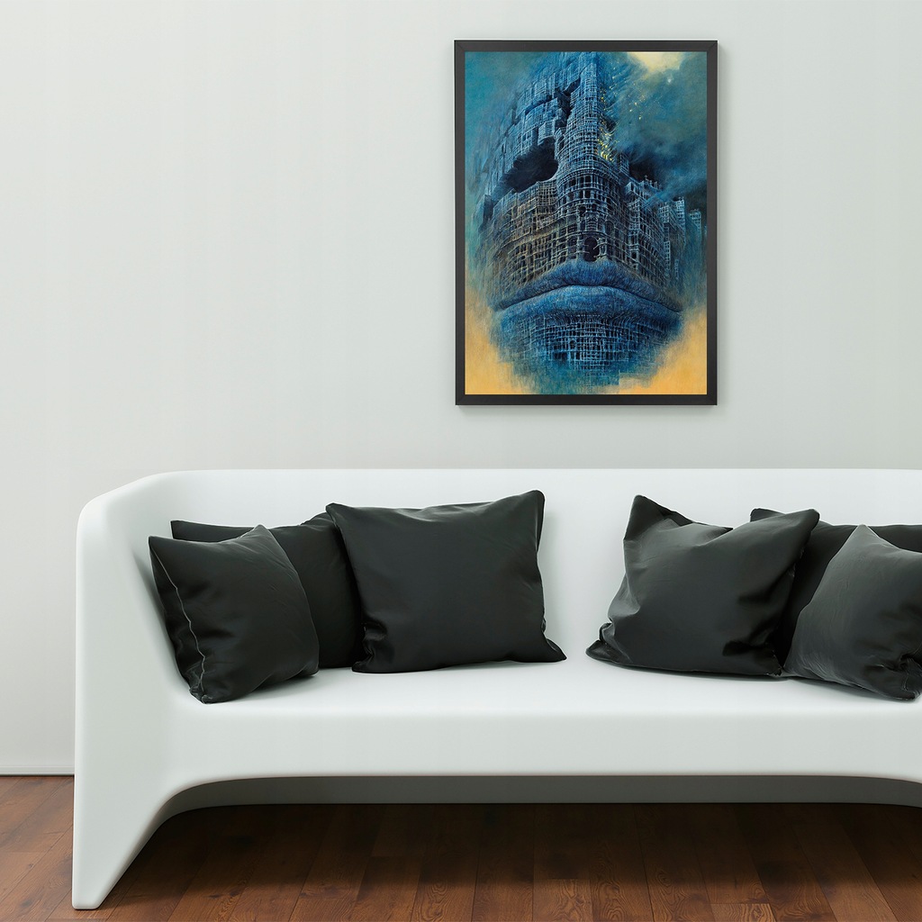 Reprodukcja obrazu Zdzisława Beksińskiego w formie plakatu, 70 × 50 cm, kadrowana, wydrukowana na papierze fotograficznym, oprawiona w ramę z szybą pleksi.