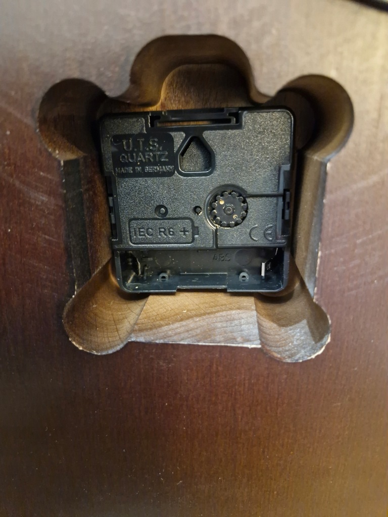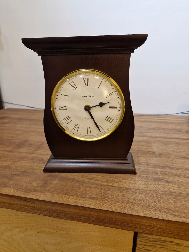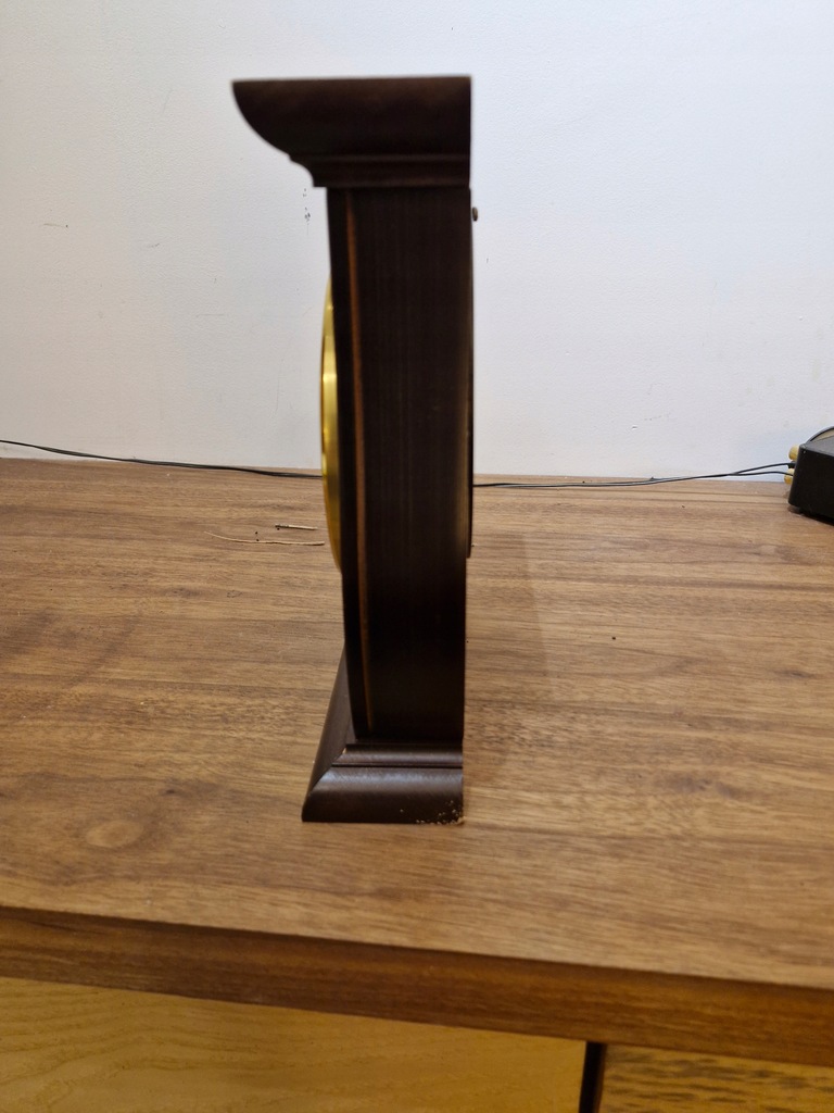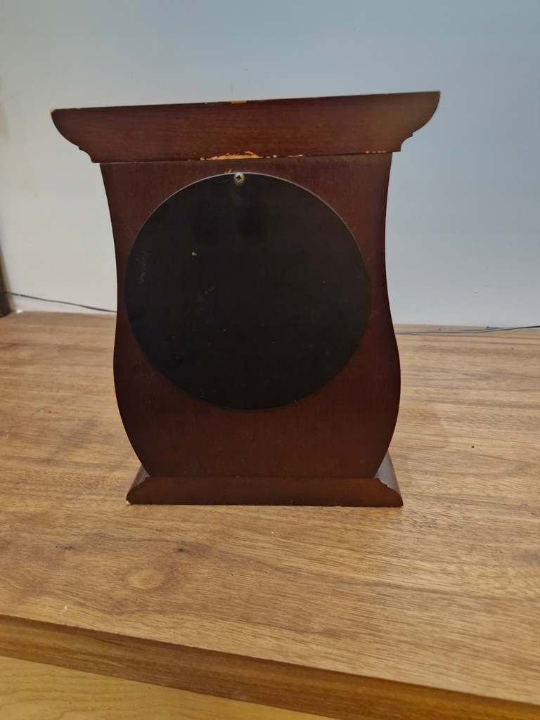 Bardzo ładny zegar angielski. Sprawny, mechanizm cichy, pasuje bateria AA z tym, że trzeba ją odpowiednio ustawić. Tarcza papierowa, nieznaczne ślady zarysowań.
