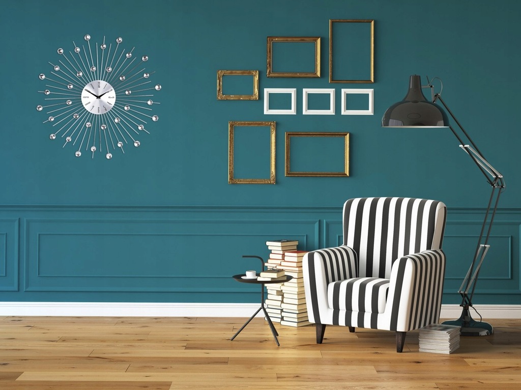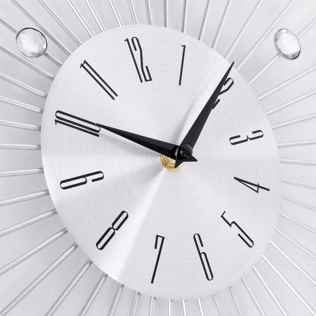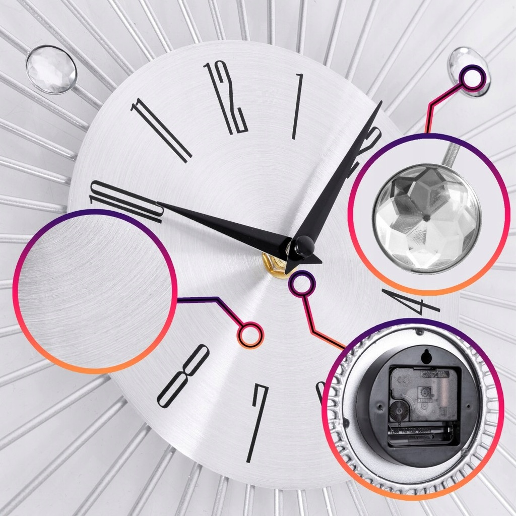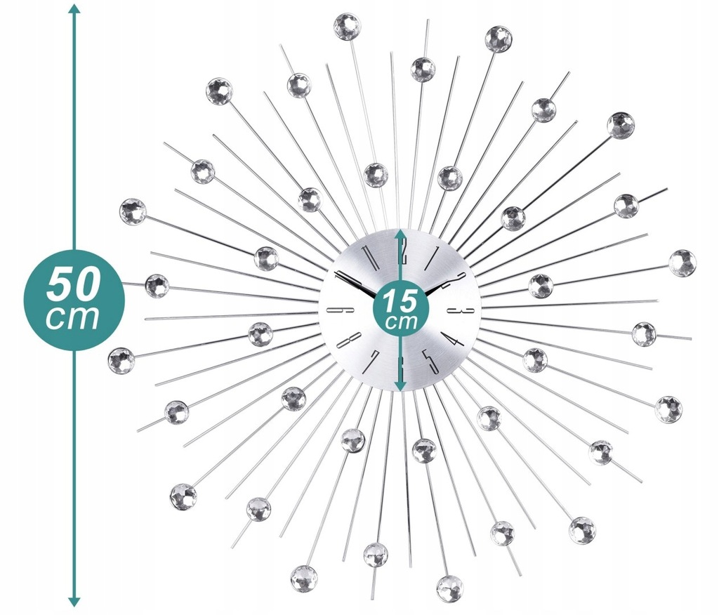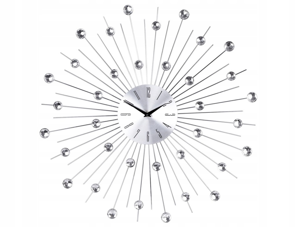 Niezwykle elegancki i stylowy zegar ścienny. Na promieniach znajdują się różnej wielkości kryształki nadające niezwykłego efektu. Doskonała ozdoba mieszkania, biura, sklepu lub restauracji.