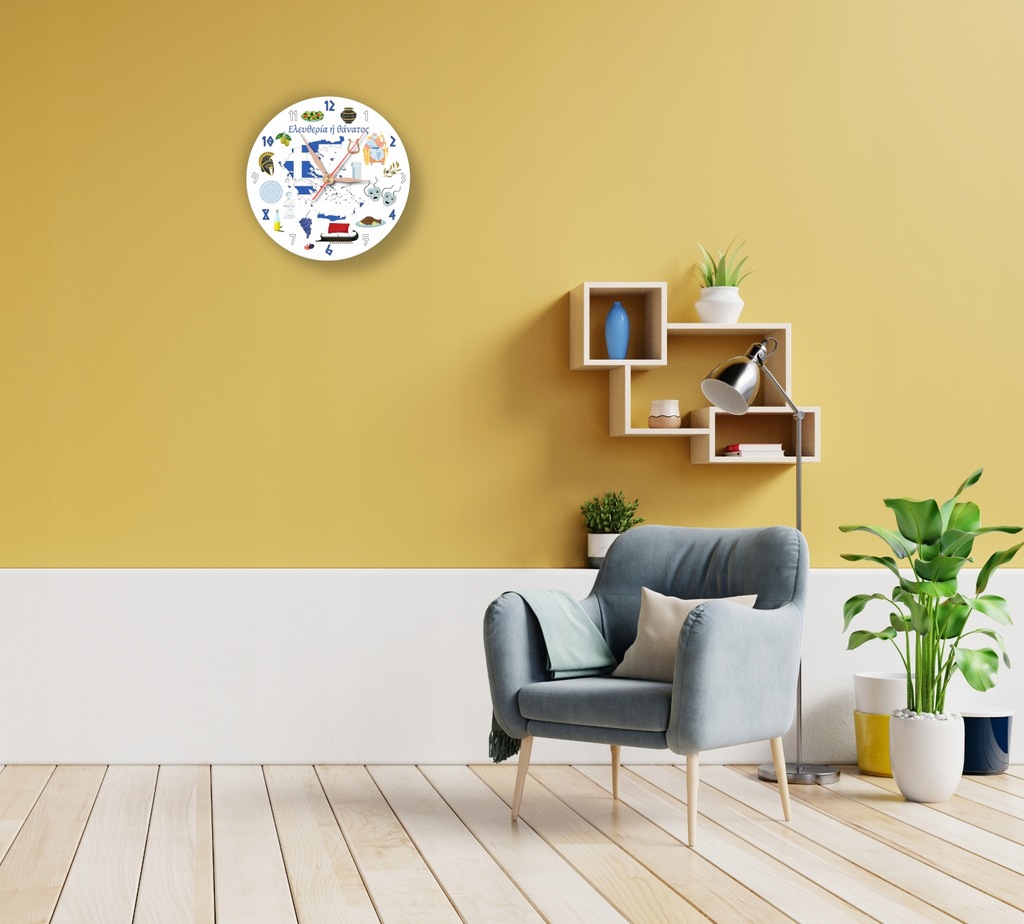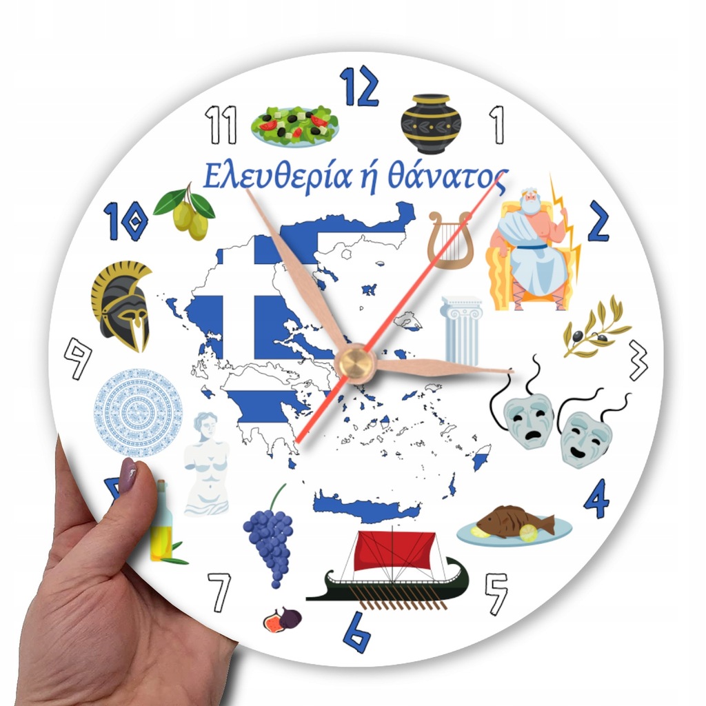 Okrągły zegar ścienny z symbolami charakterystycznymi dla państwa Grecja oraz mapą państwa w kolorach flagi Grecji.