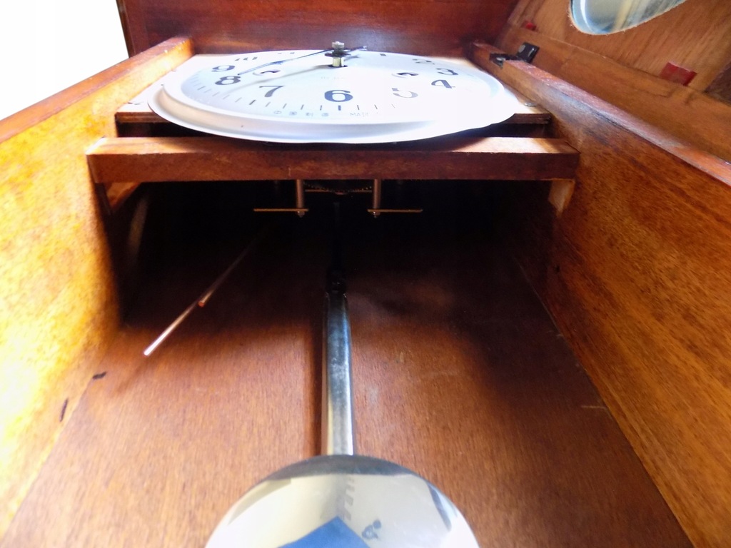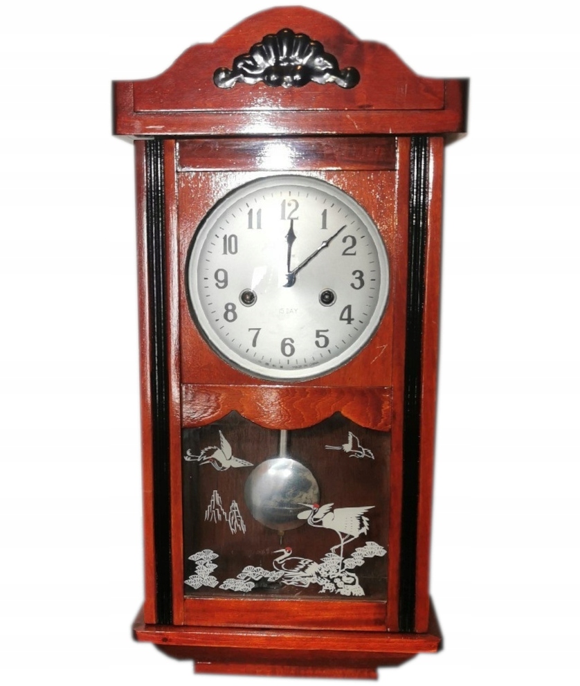 Zegar wiszący "Polaris" 15 day. Skrzynia drewniana, w dobrym stanie jak widać na zdjęciu. Mechanizm sprawny, wybija w gong dwustrunowy połówki i pełne godziny. Naciąg 15-sto dniowy. Wymiary; wys. 59 x 28 x 13 cm. Kluczyk do zegara w zestawie z zegarem.