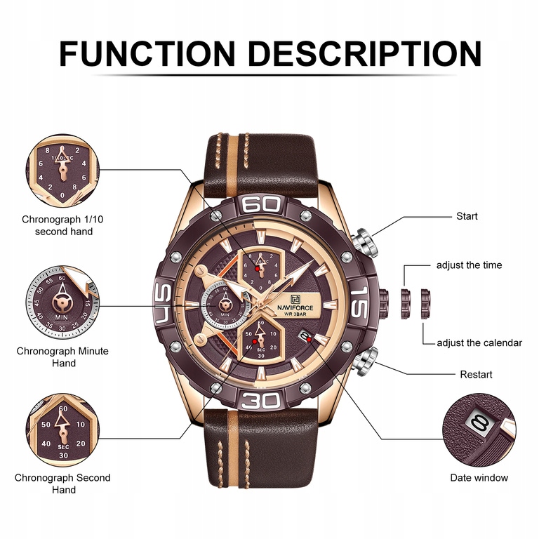 - Funkcje: Antyalergiczna powłoka, Powłoka IPS, Datownik, Mineralne szkło, Chronograf, Pasek skórzany