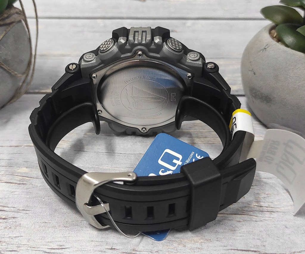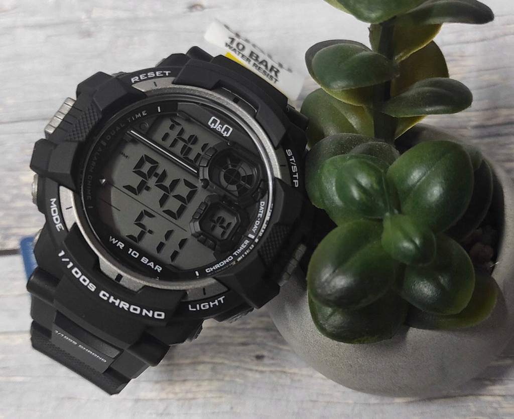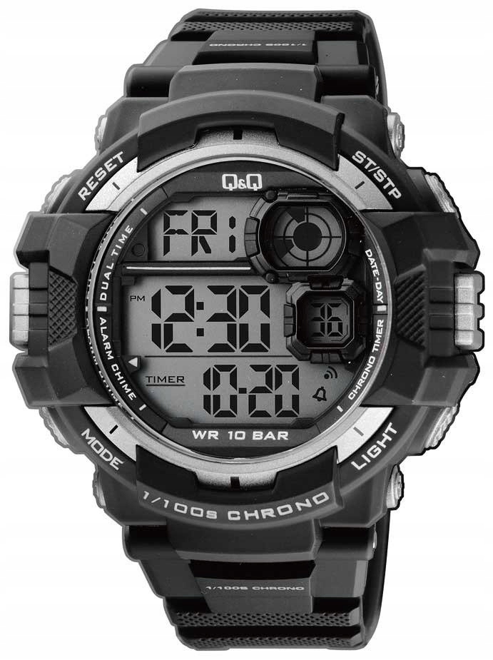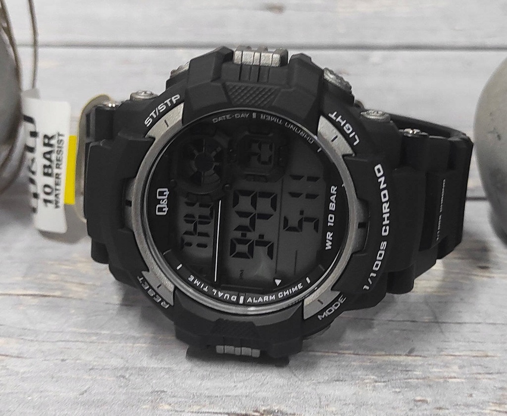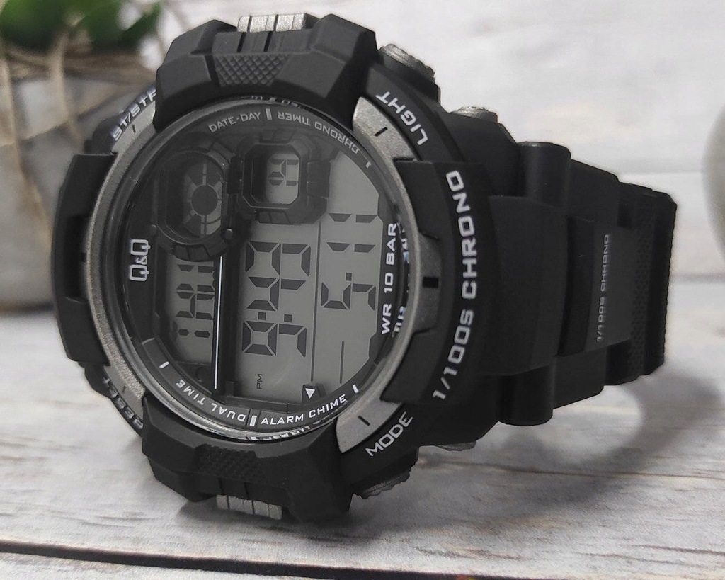 Sportowy elektroniczny męski / młodzieżowy zegarek Q&Q z serii Outdoor Gear M143-002 - klasa szczelności 100M. Koperta i pasek z tworzywa sztucznego. Metronom, 5 alarmów, stoper, timer, podwójny czas, podświetlenie