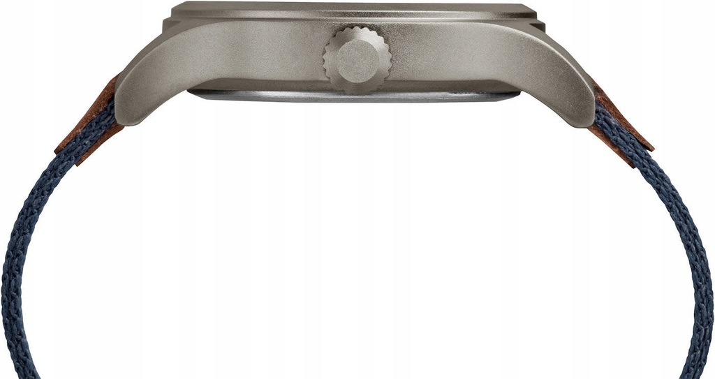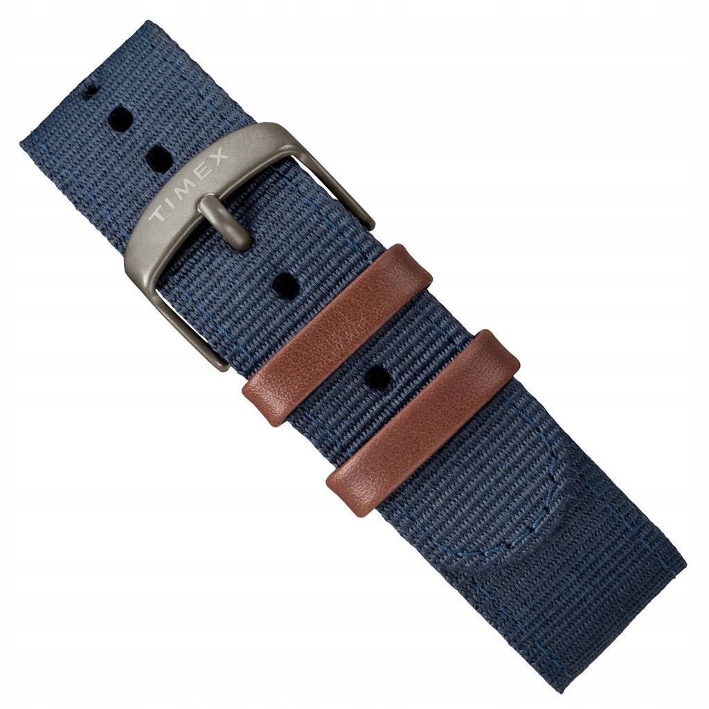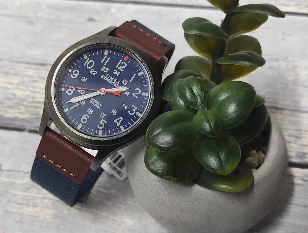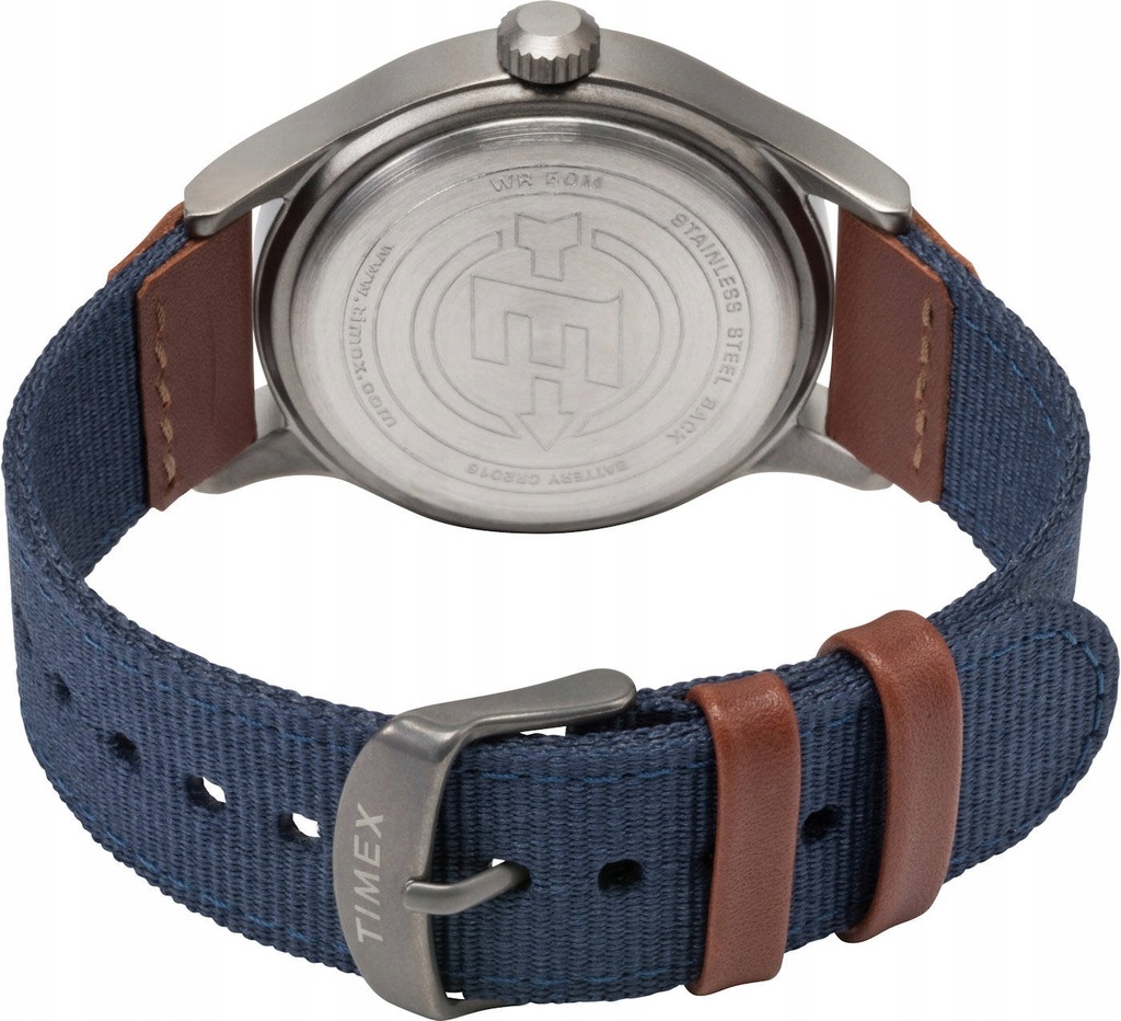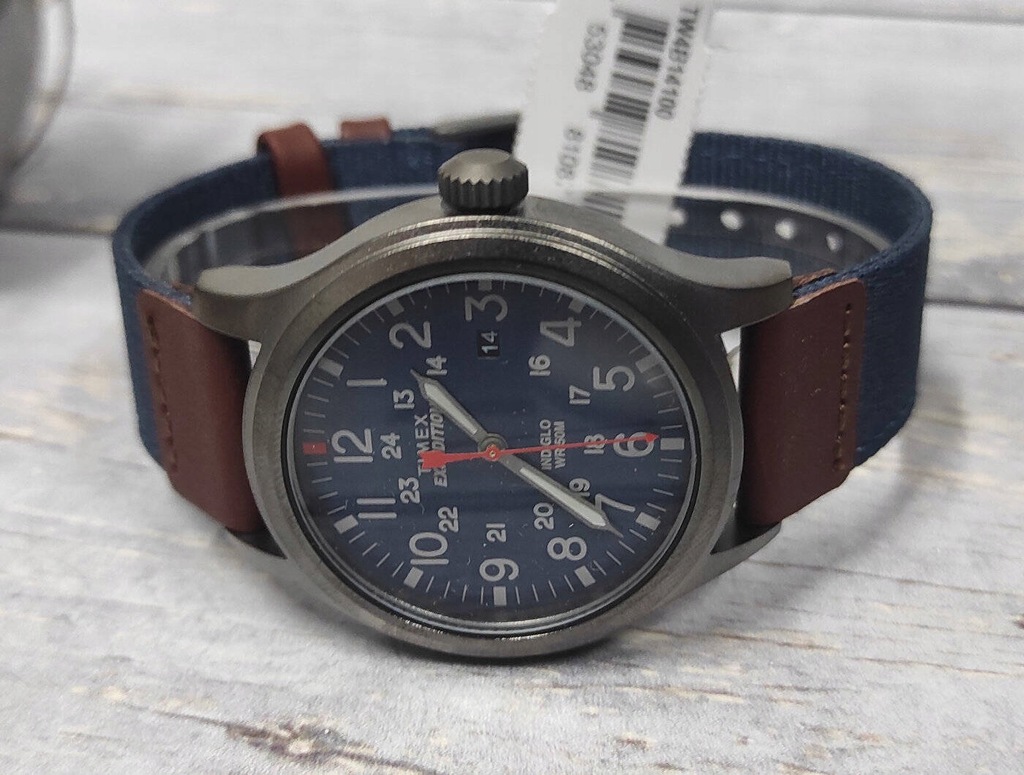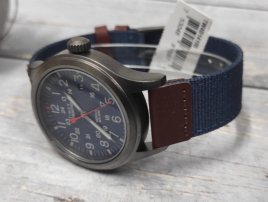 Sportowy męski młodzieżowy zegarek TIMEX Expedition Scout TW4B14100 - metalowa koperta w kolorze tytanowym, dwukolorowy skórzano-materiałowy pasek, niebieska tarcza. Podświetlenie INDIGLO. Datownik. Klasa szczelności 50M