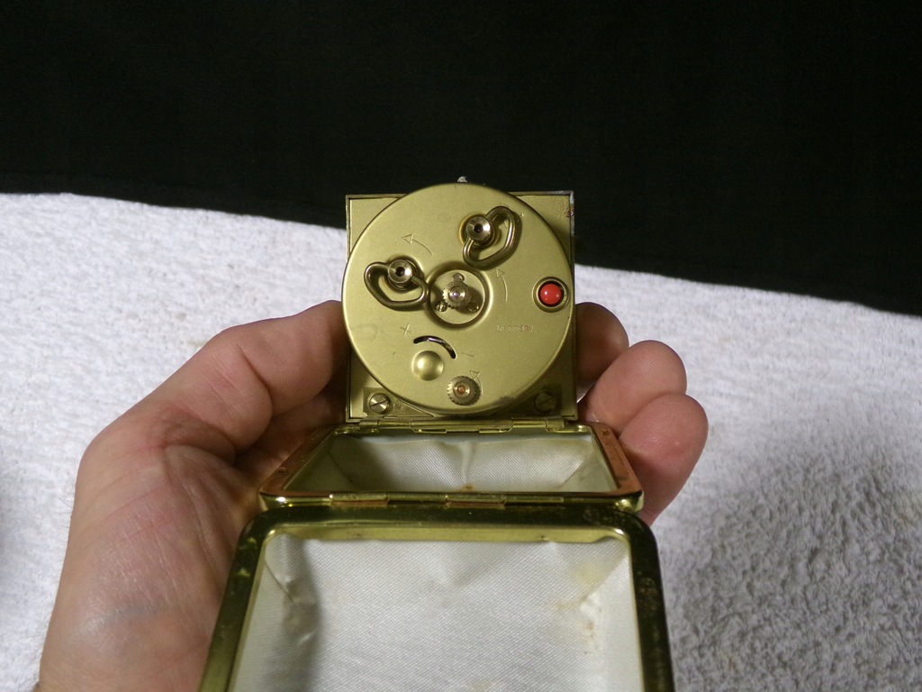 Zegarek w etui o średnicy 7x6,5 cm,wadze 190 gramów .Stan zachowany dobry,etui się nie zamyka i zegarek nakręcony jest do oporu i nie chodzi,nie wiem co mu dolega.