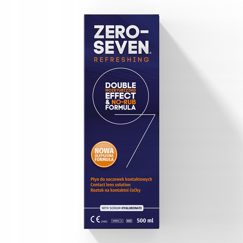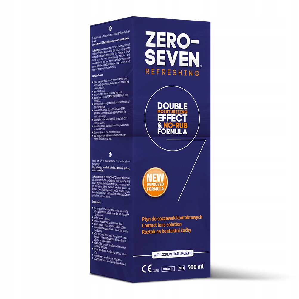 Dzięki formule zawierającej obydwa składniki, płyn zapobiega nieprzyjemnemu uczuciu suchości oka. Formuła NO RUB umożliwia usuwanie zanieczyszczeń, dezynfekcję i odbiałczanie bez konieczności mechanicznego czyszczenia soczewek. Każde opakowanie płynu Zero Seven Refreshing zawiera pojemnik na soczewki kontaktowe.