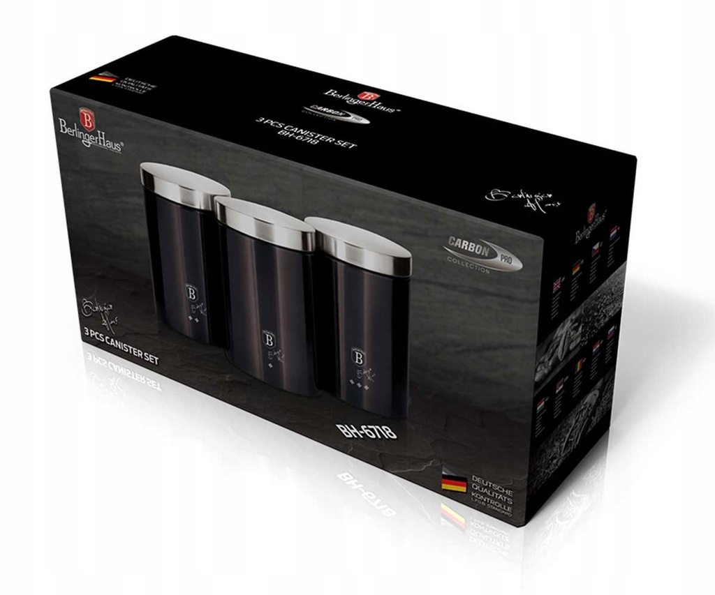 Zestaw 3 pojemników kuchennych na kawę, herbatę i cukier firmy BERLINGER HAUS z serii CARBON PRO METALLIC LINE.