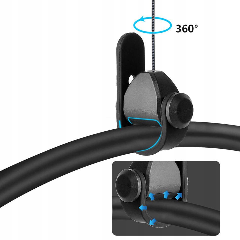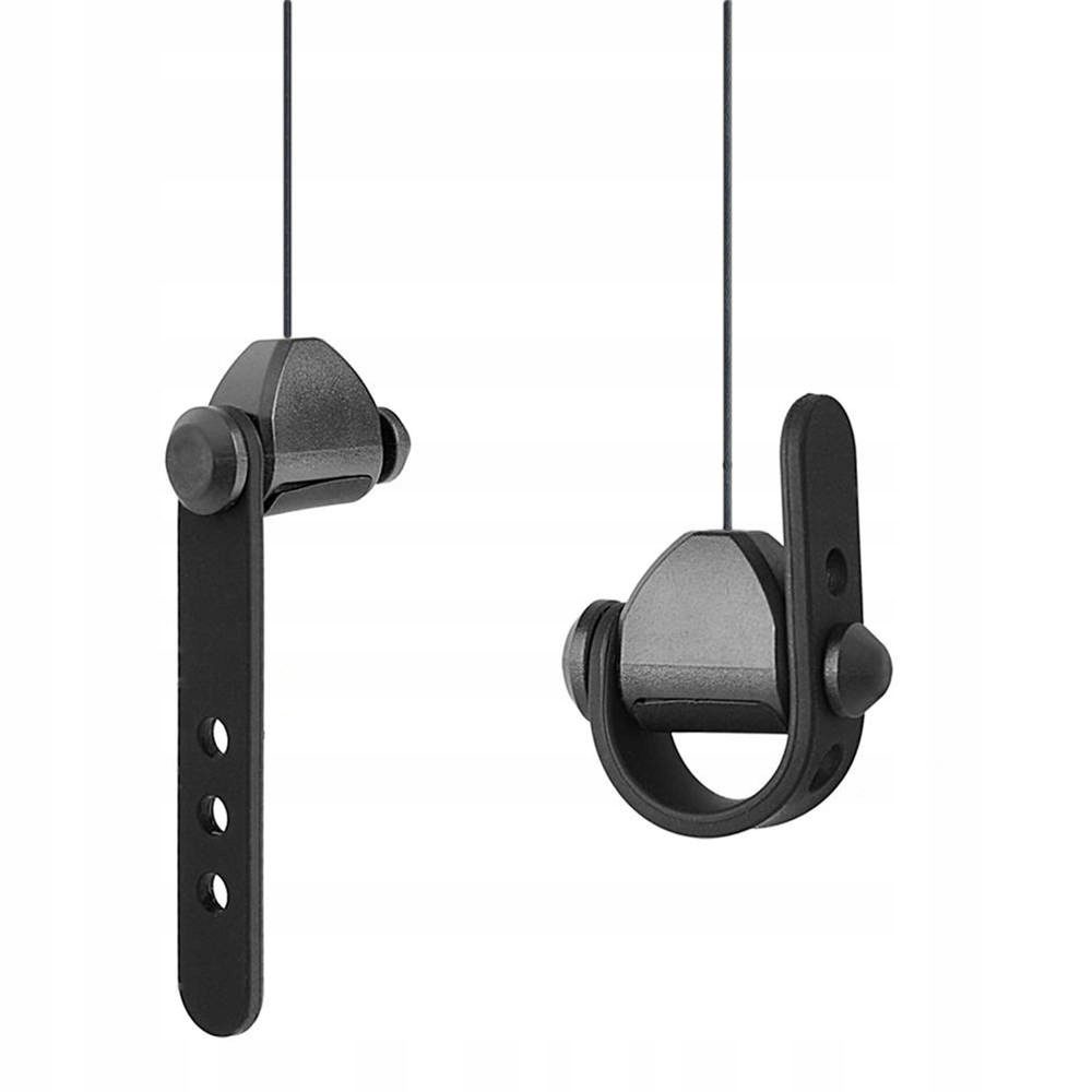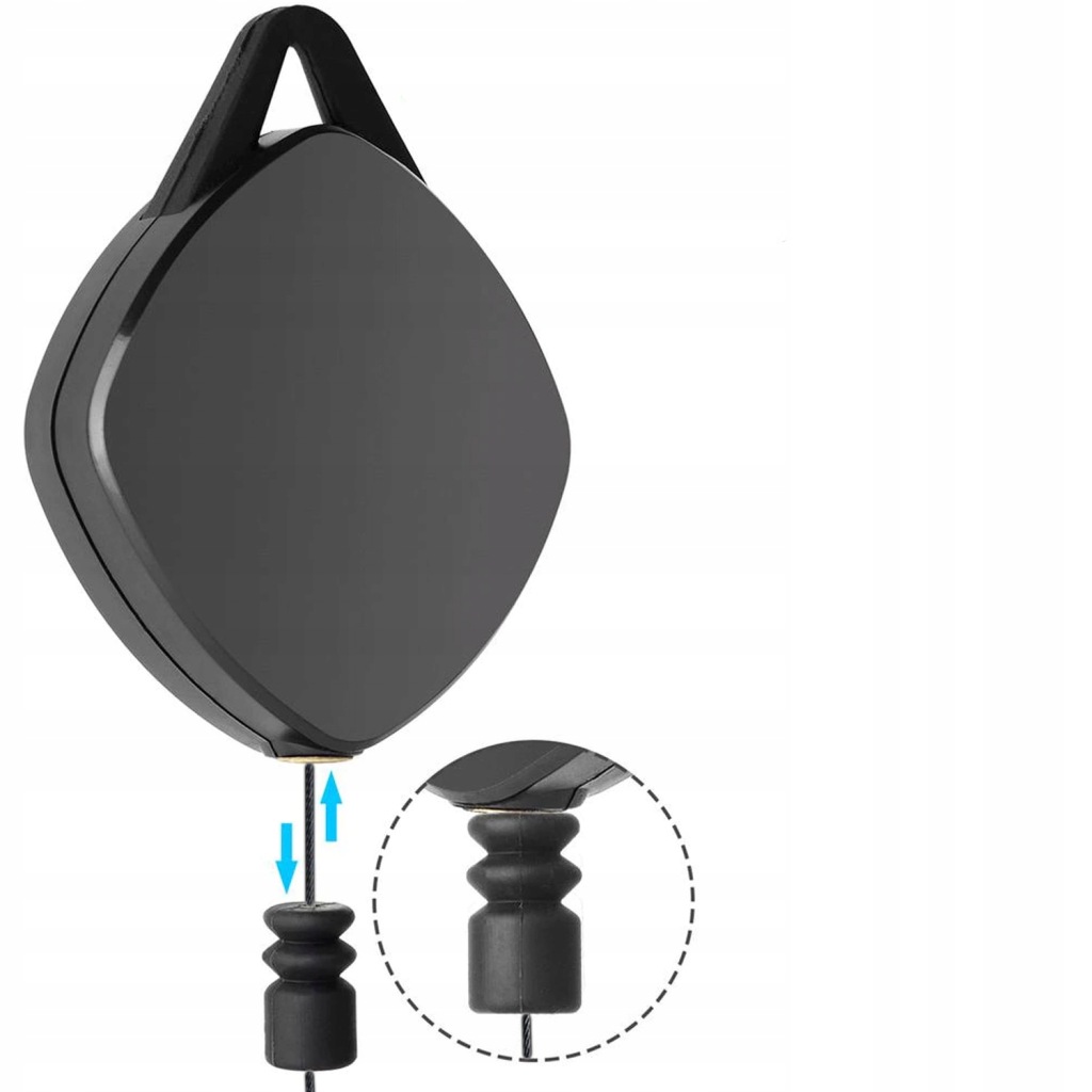 Haki wystarczy przykleić na płytkach pokrytych mocnym klejem. Haki na samoprzylepnych, przeźroczystych płytkach bardzo dobrze trzymają się sufitu i nie zwracają na siebie zbędnej uwagi. Regulacja długości wysuwania się kabla za pomocą ogranicznika zamontowanego pod gumową osłoną na lince. Drugim sposobem na zamontowanie haków jest użycie kołków dołączonych do zestawu, po osadzeniu ich w suficie wystarczy wkręcić w nie haki.