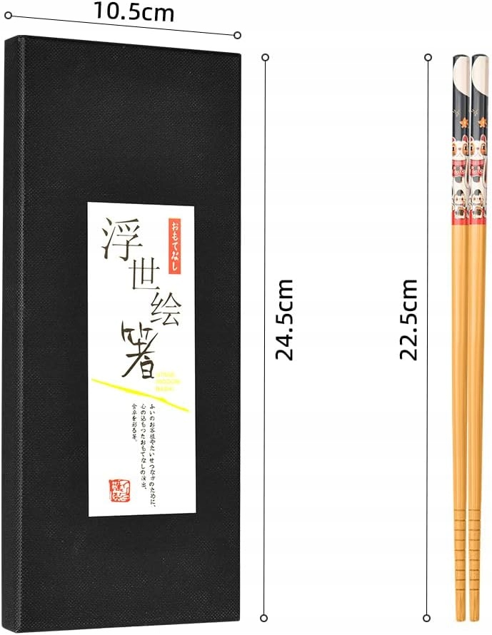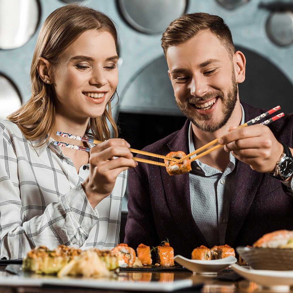 Każda para posiada swój unikalny wzór, co nie tylko ułatwia rozpoznanie ich przy stole, ale też dodaje elegancji. Kwadratowy kształt zapobiega staczaniu się z talerza, a antypoślizgowe końcówki z rowkami zapewniają precyzyjne chwytanie każdego kawałka sushi, makaronu czy ryżu. Lekkie, wygodne i doskonałe zarówno dla początkujących, jak i doświadczonych użytkowników.