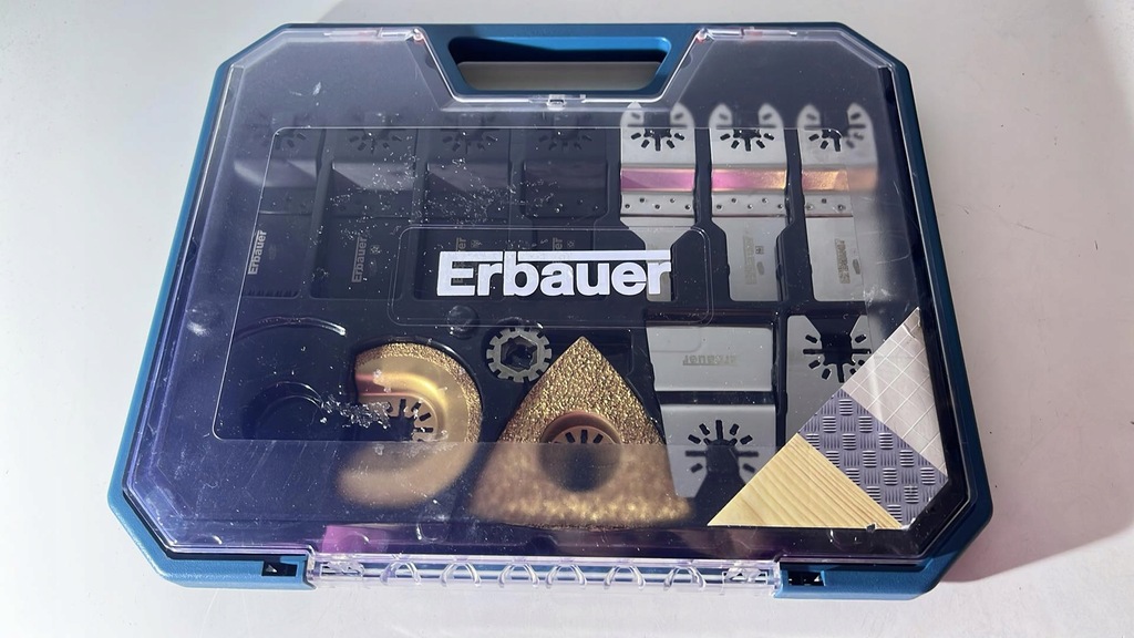 3 x 34mm brzeszczoty HCS (2 x precyzyjne do drewna i 1 x prosty ząb do drewna/plastiku), bimetalowy brzeszczot do drewna/plastiku/metalu (34mm), bimetalowy brzeszczot HSS do metalu/plastiku/drewna (34mm), 3 x brzeszczoty ze stali nierdzewnej do drewna/plastiku (30mm), brzeszczot półksiężycowy HSS do drewna/plastiku/metalu (80mm), trójkątne ostrze lutowane z węglików spiekanych (78mm), półksiężyc lutowany z węglików spiekanych ( 63,5 mm), skrobak zakrzywiony ze stali nierdzewnej L37 (52 x 74,5 mm), skrobak prosty ze stali nierdzewnej (52 x 74,5 mm) i 2 adaptery mocujące ostrza.