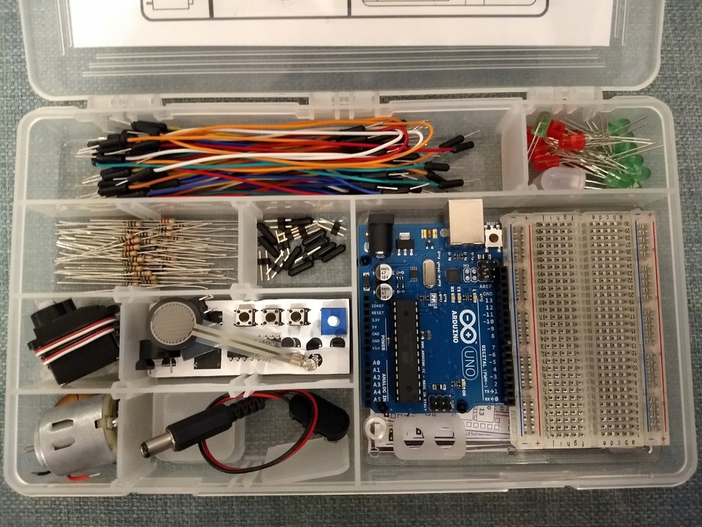 - Liczne akcesoria (przewody, diody LED, oporniki, silnik servo, silnik DC, termometr, potencjometr, adapter do baterii 9V, oraz inne elektroniczne komponenty)