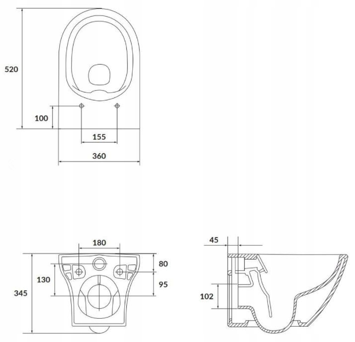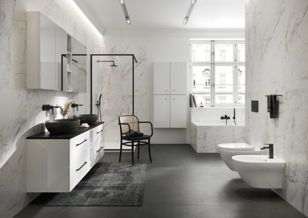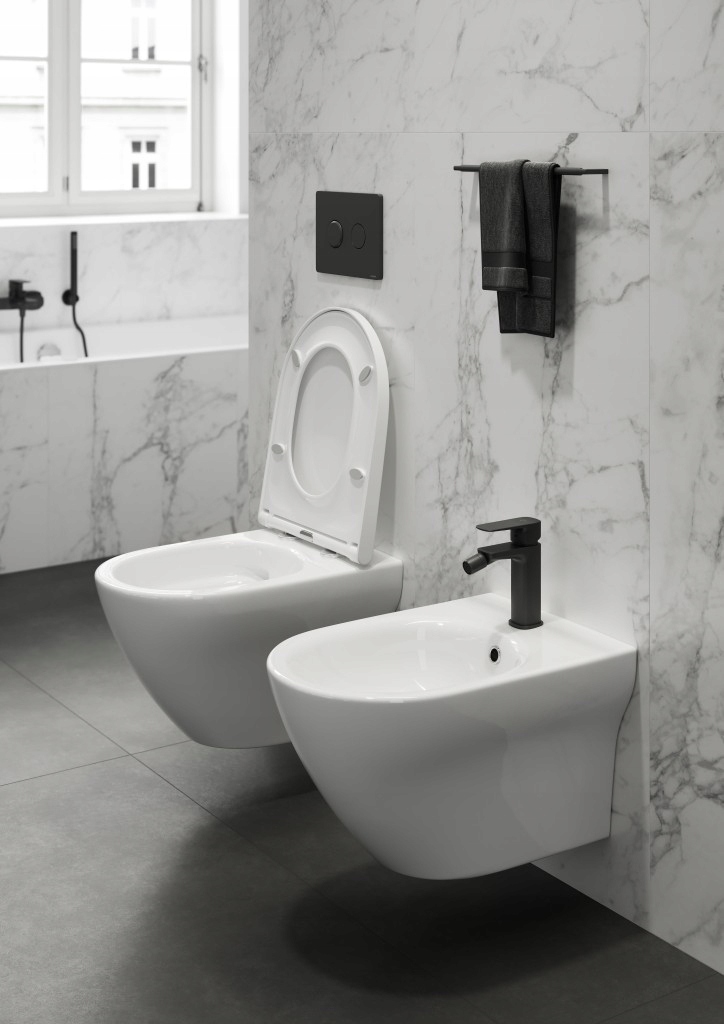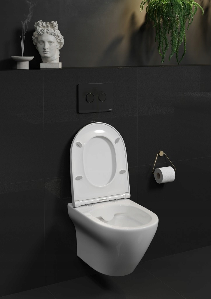 Miska wisząca LARGA, CLEAN ON z unikalną białą powierzchnią ceramiczną /bezpierścienia spłukującego/ z tylnym odpływem, funkcją spłukiwania 3,5 l w celu znacznego zmniejszenia zużycia wody.