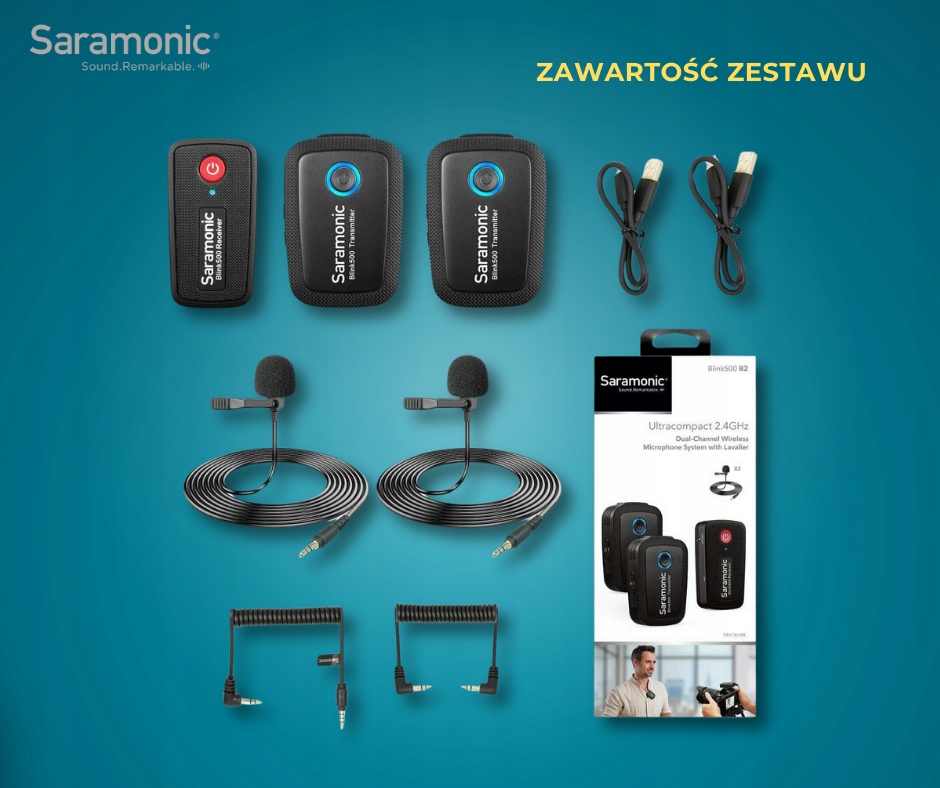 Saramonic BLINK500 B2 to bezprzewodowy system do nagrywania, pracujący w cyfrowej transmisji 2.4 GHz. Występuje w konfiguracji odbiornika z dwoma nadajnikami.
