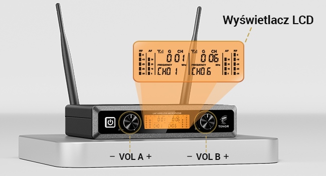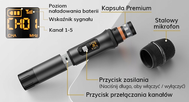 Mikrofony zostały wykonane z wysokiej jakości metalu, a ich stalowa siatka skutecznie chroni przed uderzeniami i korozją. Metalowa obudowa odbiornika została wyposażona w czytelny wyświetlacz LCD, który informuje o częstotliwości, sile sygnału, poziomie baterii i innych parametrach, co zapewnia pełną kontrolę nad urządzeniem.