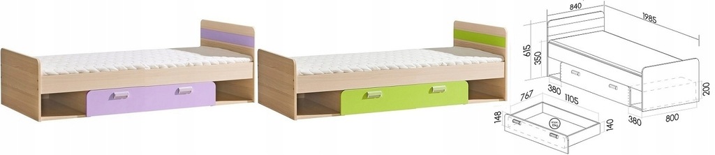 - łóżko 13 bez materaca : 198,5cm x 61,5cm x 84cm, pow. spania 80x195