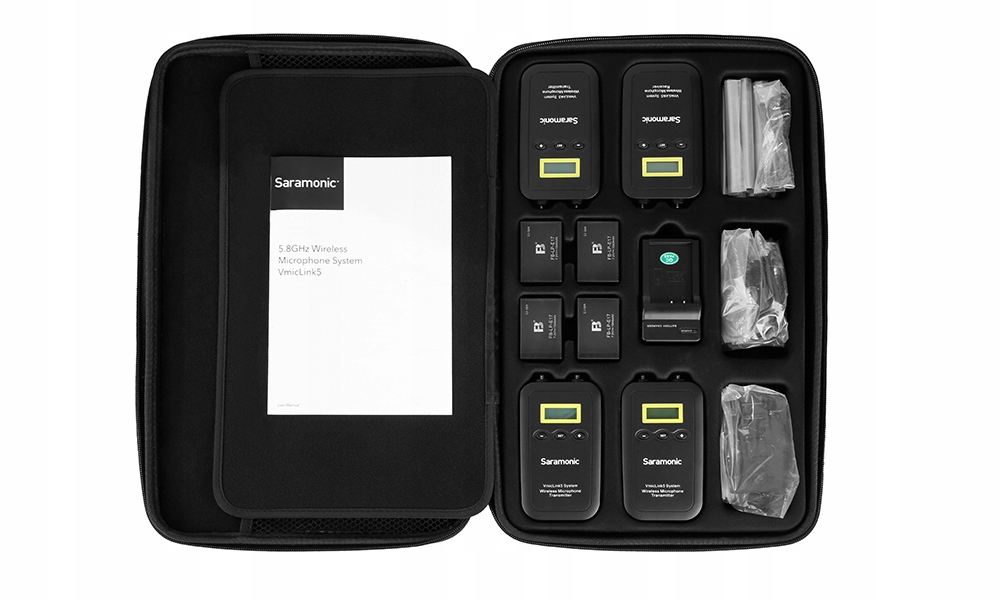 W zestawie Saramonic VmicLink5 poza samymi nadajnikami i odbiornikiem oferuje komplet praktycznych akcesoriów, w tym: mikrofon, akumulatory, ładowarka, mocowania do paska i aparatu. Dodatkowym atutem jest twarda walizka mieszcząca wszystkie elementy zestawu, która idealnie sprawdzi się w podróży.