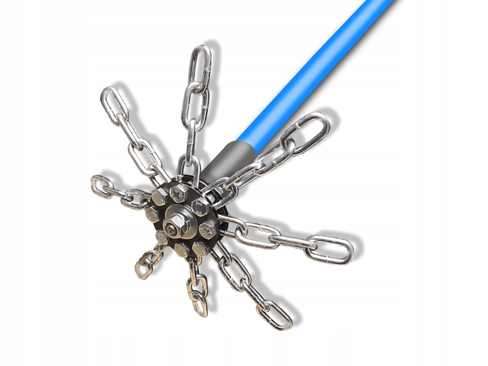 Łańcuch założony na głowicę jest uniwersalnej długości – po rozkręceniu ma ok 25cm, pasuje do każdego kształtu komina. Zakładając w głowicy odpowiedni wkład Turbospinerem można czyścić: