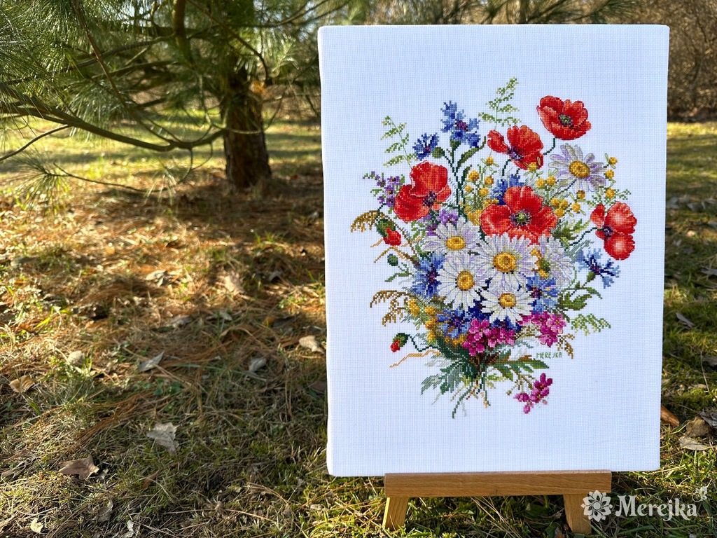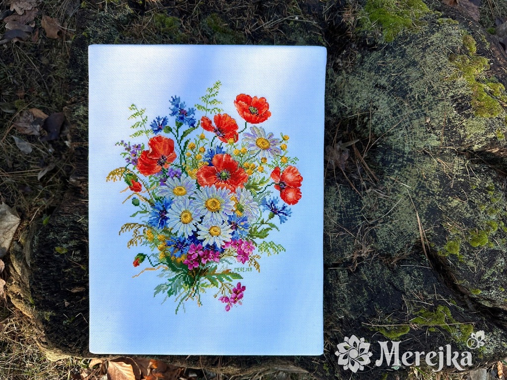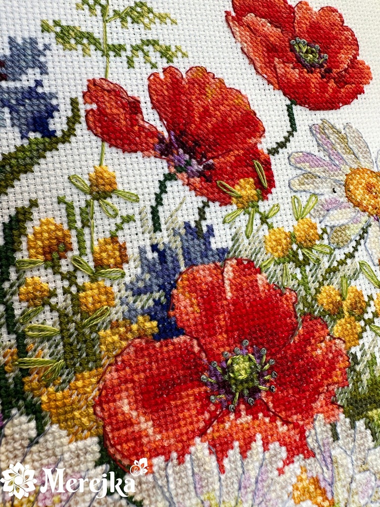 Zestaw do haftu krzyżykowego Merejka K-222A "Łąka kwitnie", zawiera: kanwa Zweigart Aida 16ct., 63 oczek krzyżykowych na 10 cm, nici mulina DMC, igła, schemat, instrukcja, wymiary: 30x26 cm